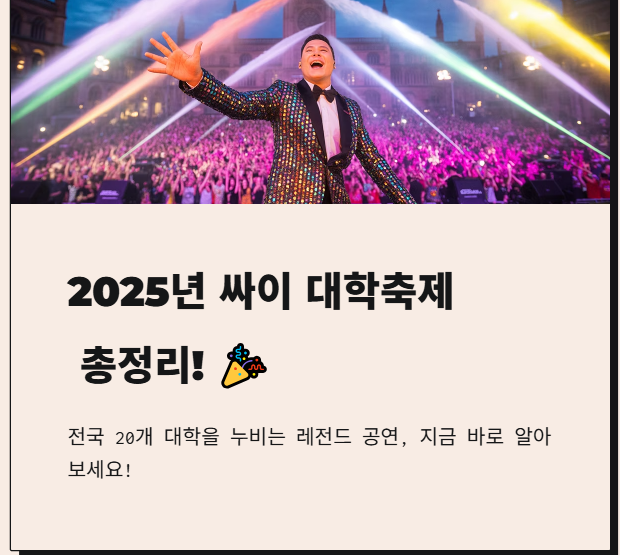 전국 캠퍼스를 돌며 레전드 무대를 선사하는 싸이의 공연은 이제 ‘전통’이 됐다고 해도 과언이 아닙니다. 5월 한 달간 이어지는 전국 투어 일정부터 출입 가능 캠퍼스, 라인업, 그리고 관람 꿀팁까지 지금 한 번에 정리해 드릴게요.
