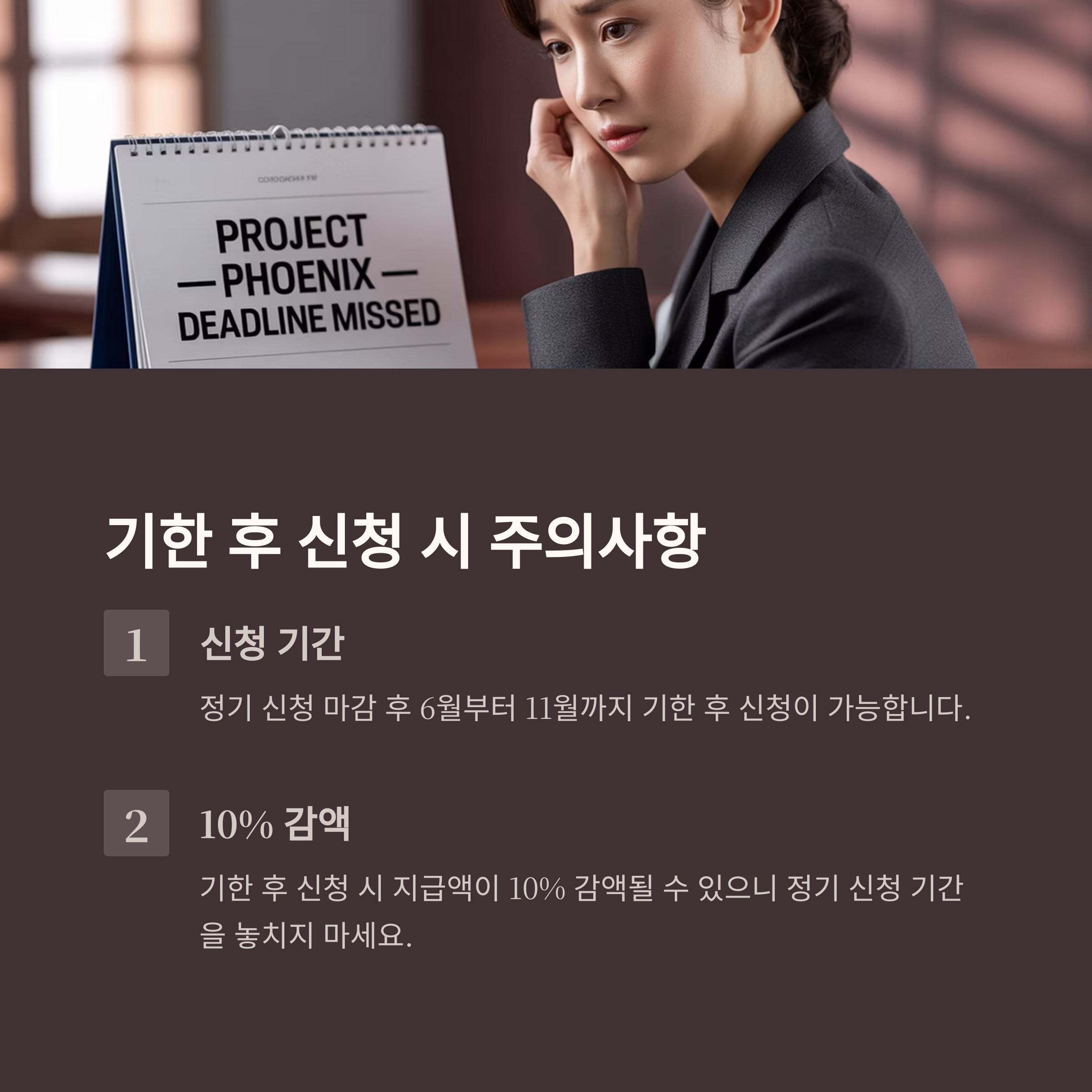 • 10% 감액 가능성: 가장 중요한 주의사항은 지급액이 10% 감액될 수 있다는 점입니다. 기한 내 신청한 경우보다 적은 금액을 받게 될 수 있으므로, 가능한 한 정기 신청 기간을 놓치지 않는 것이 가장 유리합니다.
