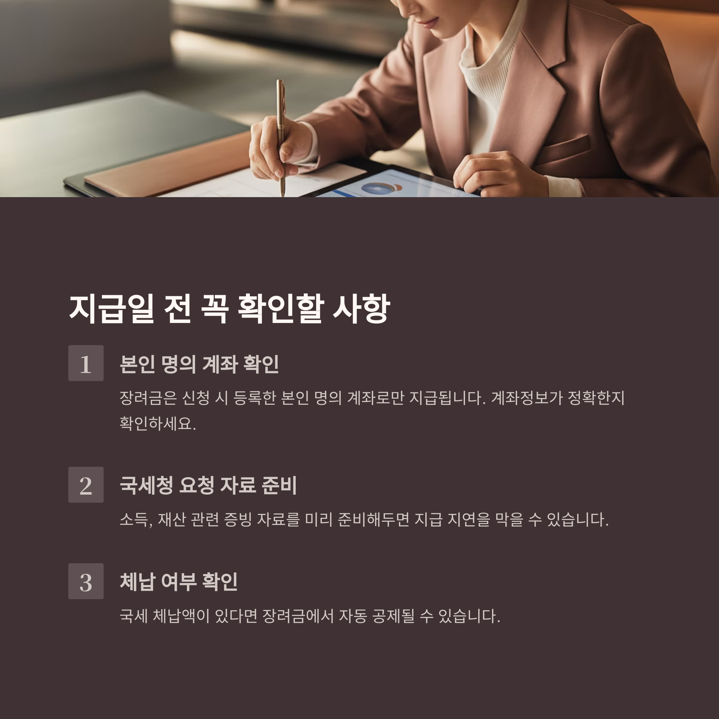 • 본인 명의 계좌 확인: 장려금은 신청 시 등록한 본인 명의 계좌로만 지급됩니다. 계좌번호 오류가 있거나, 타인 명의 계좌를 등록했을 경우 지급이 지연되거나 아예 보류될 수 있습니다. 홈택스 또는 손택스 앱에 접속하여 등록된 계좌 정보가 정확한지 다시 한번 꼼꼼히 확인하세요. 만약 오류가 있다면 즉시 수정해야 합니다.