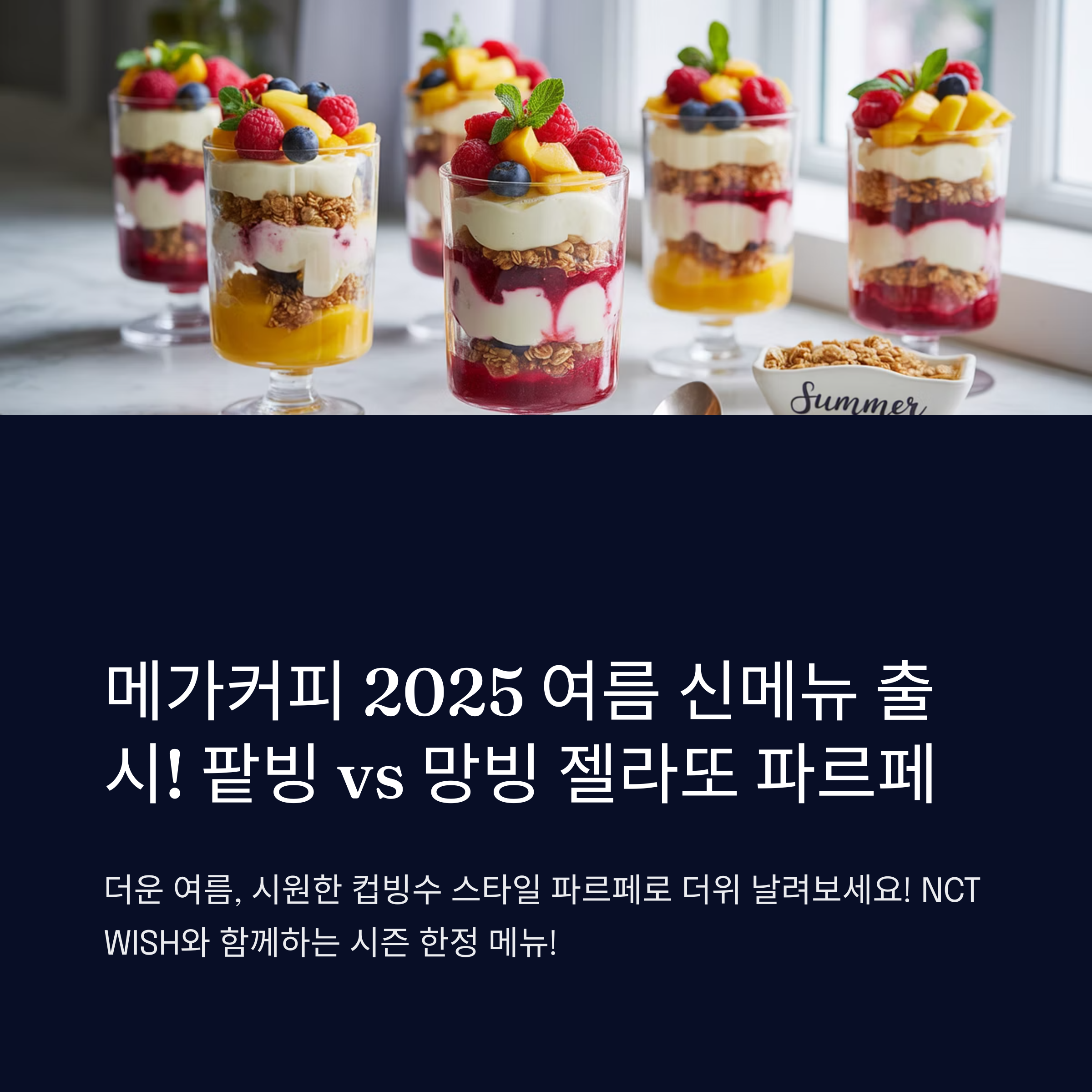 올여름, 메가커피가 정말 작정한 것 같아요! NCT WISH와의 컬래버레이션으로 눈길을 사로잡더니, 맛있는 신메뉴들을 대거 출시했습니다. 그중에서도 제 레이더망에 딱 걸린 것은 바로 이 팥빙 젤라토 파르페와 망빙 젤라토 파르페였답니다. 혼자서도 부담 없이 간편하게 즐길 수 있는 컵빙수라니, 이건 못 참죠?!