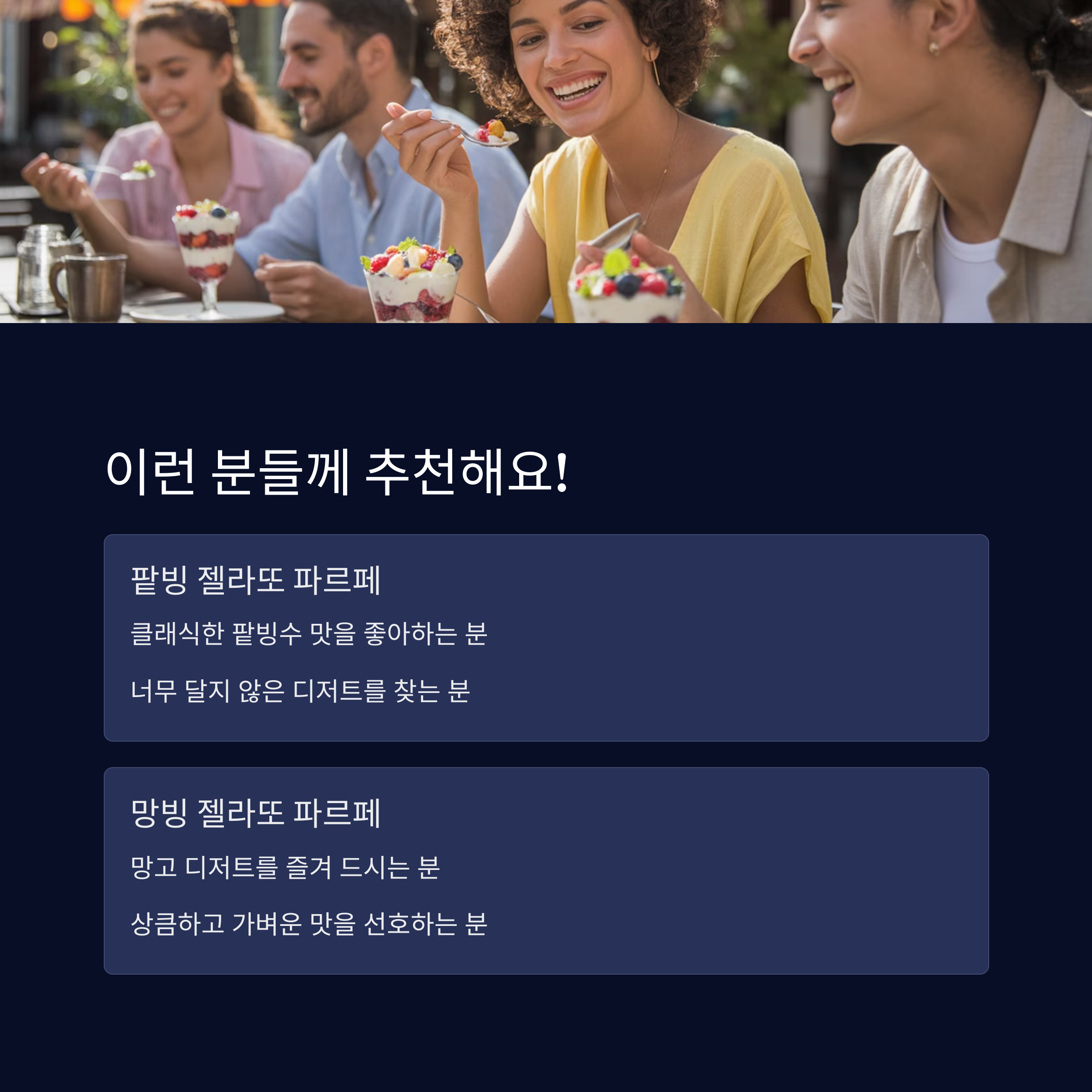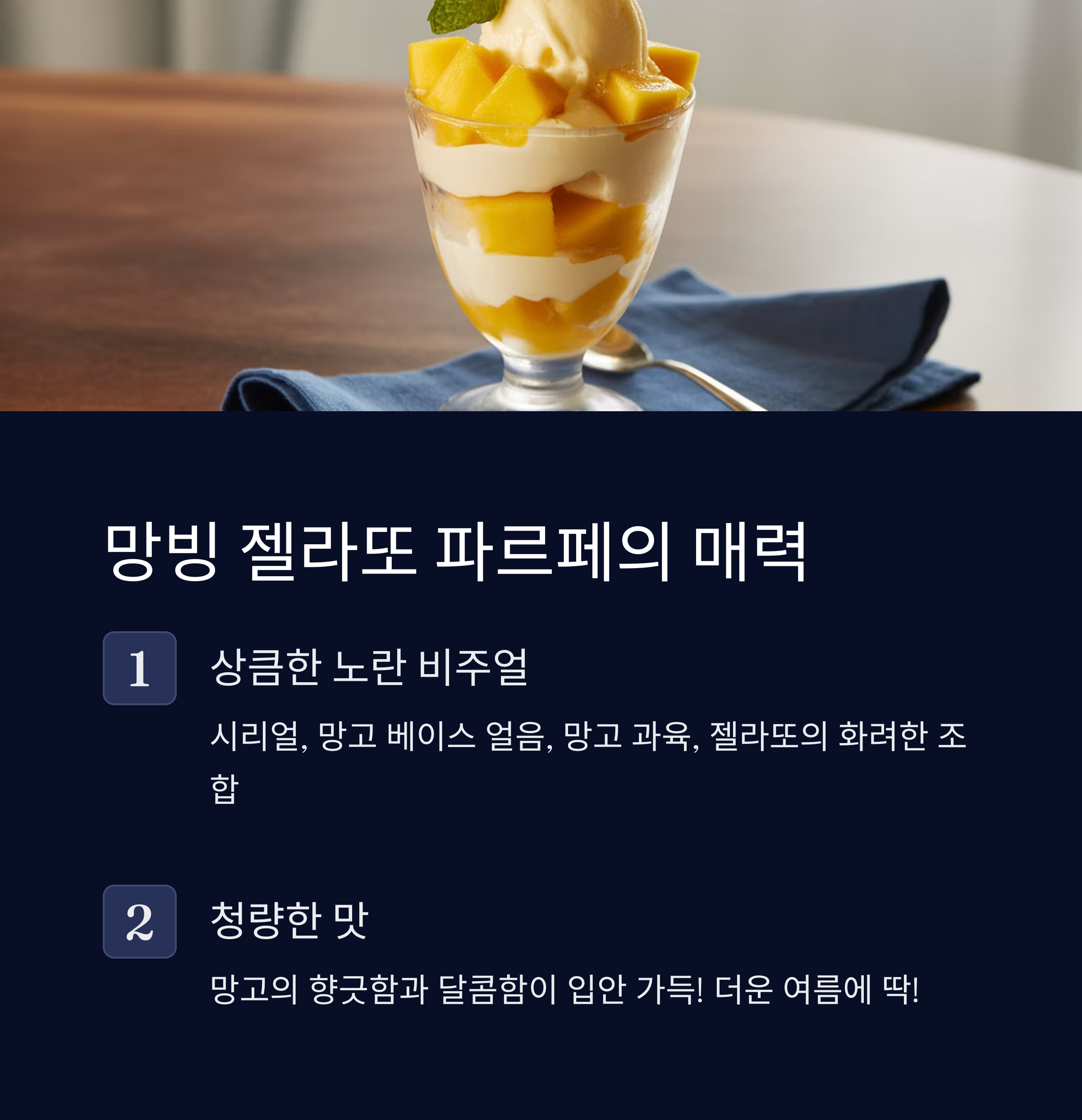 음... 정말 어려운 질문인데요. 둘 다 각자의 매력이 너무나 뚜렷해서 하나만 고르기가 힘들어요! 그래도 굳이 하나를 꼽자면, 저는 클래식하면서도 젤라토와의 조화가 인상적이었던 팥빙 젤라또 파르페에 살짝 더 마음이 가네요! 하지만 망고를 정말 좋아하신다면 망빙 파르페도 절대 후회하지 않으실 거예요!