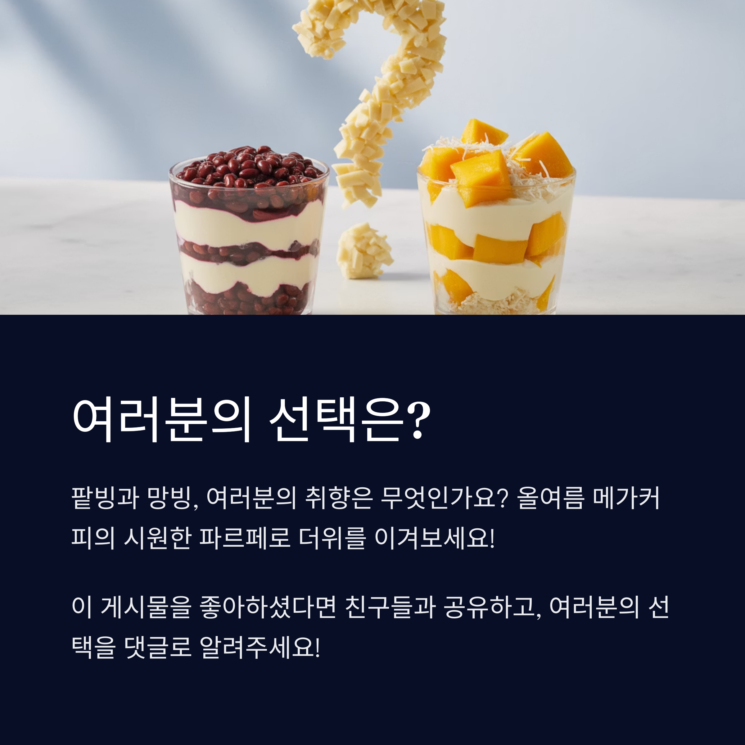 무더운 여름, 시원한 음료와 디저트가 간절해지는 계절이죠. 메가커피의 다채로운 신메뉴들과 함께라면 올여름도 맛있고 시원하게 보낼 수 있을 것 같습니다! 특히 오늘 소개해 드린 팥빙 젤라또젤라토 파르페와 망빙 젤라토 파르페는 꼭 한번 드셔보시길 강력 추천드립니다! 여러분의 취향은 팥빙인가요, 망빙인가요?! 댓글로 알려주세요!