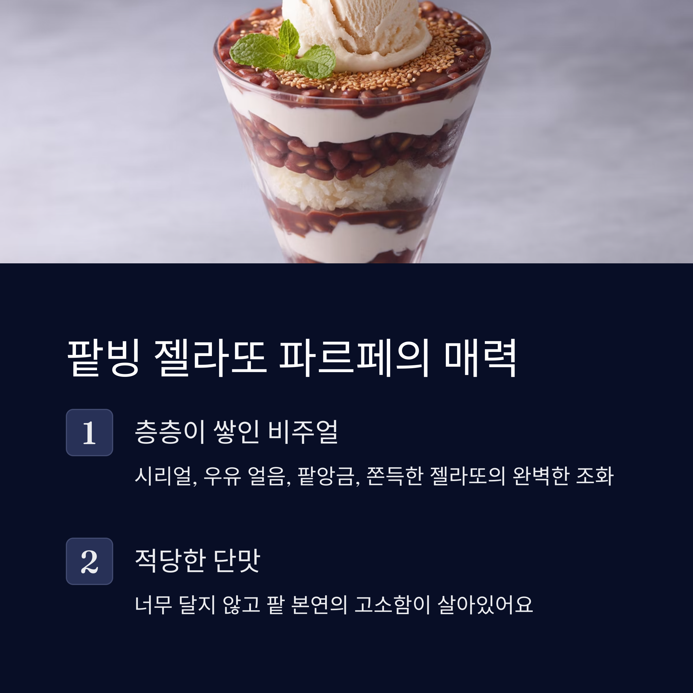 자, 그럼 먼저 K-디저트의 근본! 팥빙수부터 자세히 살펴볼까요? 이름하여 **'팥빙 젤라토 파르페'**입니다!