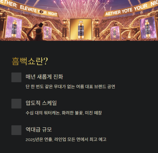 수십 대의 워터캐논, 화려한 불꽃, 미친 떼창과 함께 전국을 순회하는 이 콘서트는 여름 대표 브랜드 공연으로 자리 잡았다.