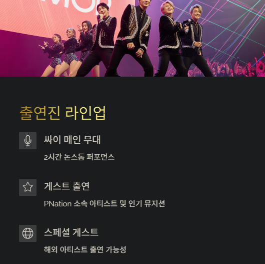 현재 공식 라인업은 비공개 상태지만, 매년 PNation 소속 아티스트 및 인기 뮤지션들이 게스트로 함께한다.