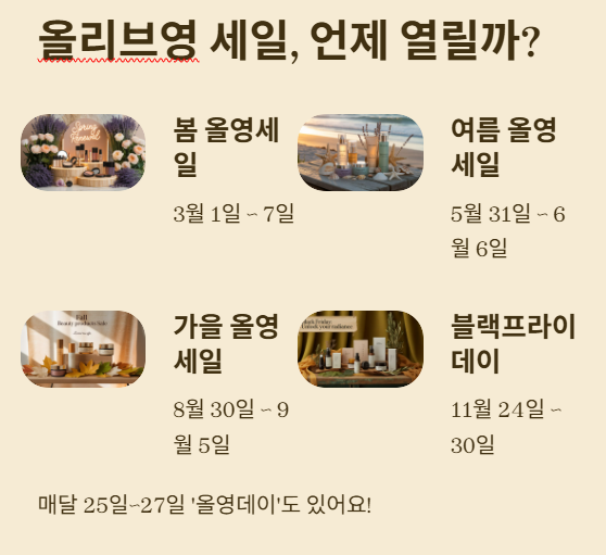 올리브영 세일은 크게 연중 네 차례 열립니다. 바로 봄, 여름, 가을, 연말 블랙프라이데이 세일이죠. 특히 매달 25일부터 27일까지 진행되는 ‘올영데이’ 역시 올리브영 세일기간에 포함되며, 멤버십 고객에게는 최대 60%까지 할인이 제공됩니다.