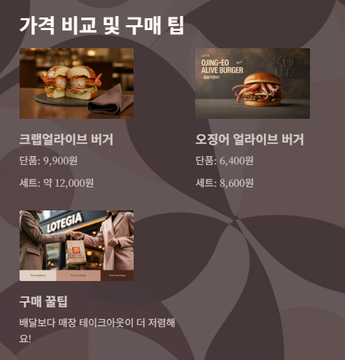 | 크랩얼라이브 버거 | 9,900원 | 약 12,000원 | 10,700원 |