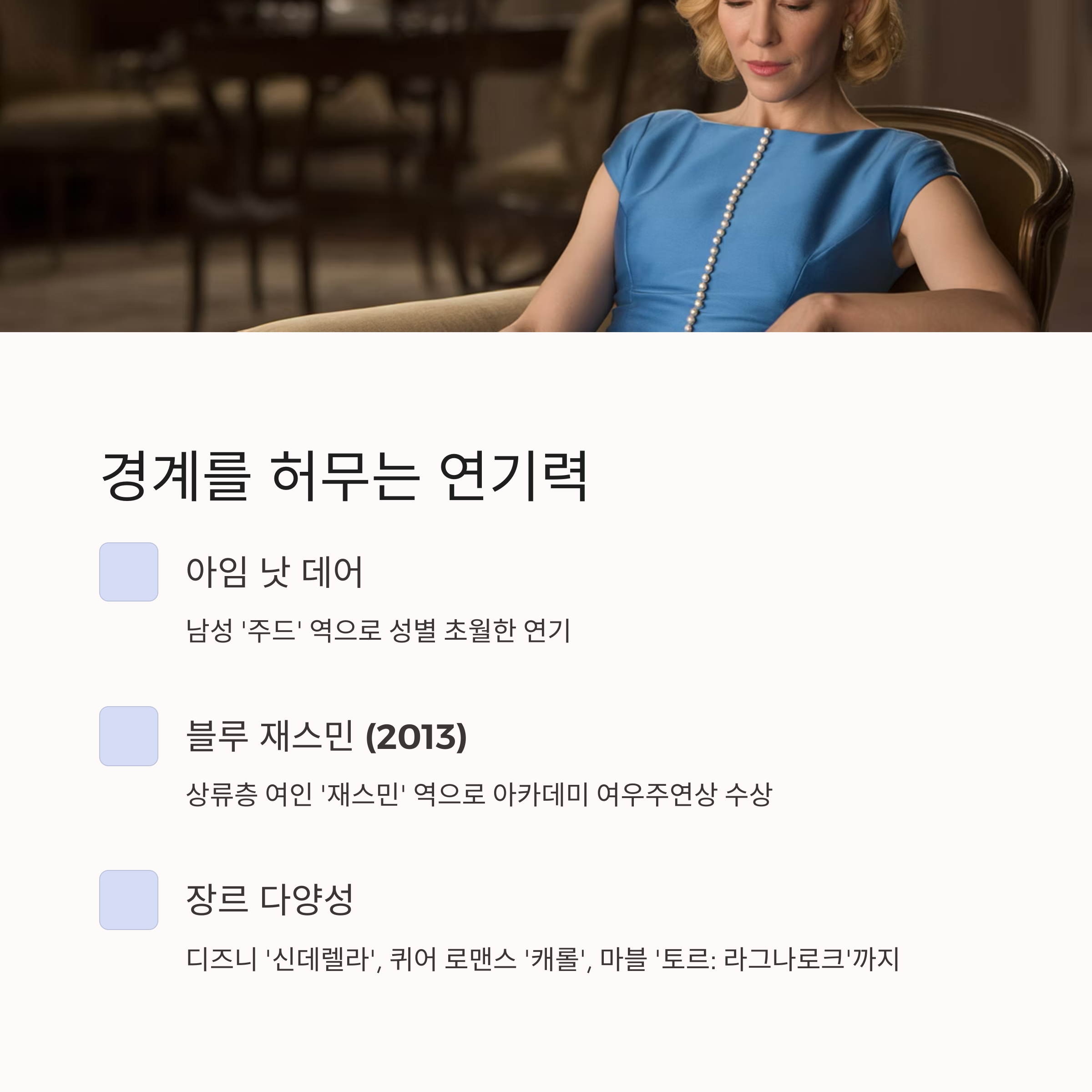- 경계를 허무는 연기: '아임 낫 데어'와 '블루 재스민': 《에비에이터》 이후 그녀는 아카데미의 단골 손님이 됩니다. 특히 밥 딜런 전기 영화 《아임 낫 데어》에서는 남성인 '주드' 역을 맡아 성별을 뛰어넘는 소름 돋는 연기로 극찬을 받았습니다. 2013년에는 우디 앨런 감독의 《블루 재스민》에서 뉴욕 상위 1% 상류층 여인 '재스민' 역을 완벽하게 소화하여 제86회 아카데미 시상식 여우주연상을 수상하며 그해 거의 모든 영화제 여우주연상을 휩쓸었습니다.