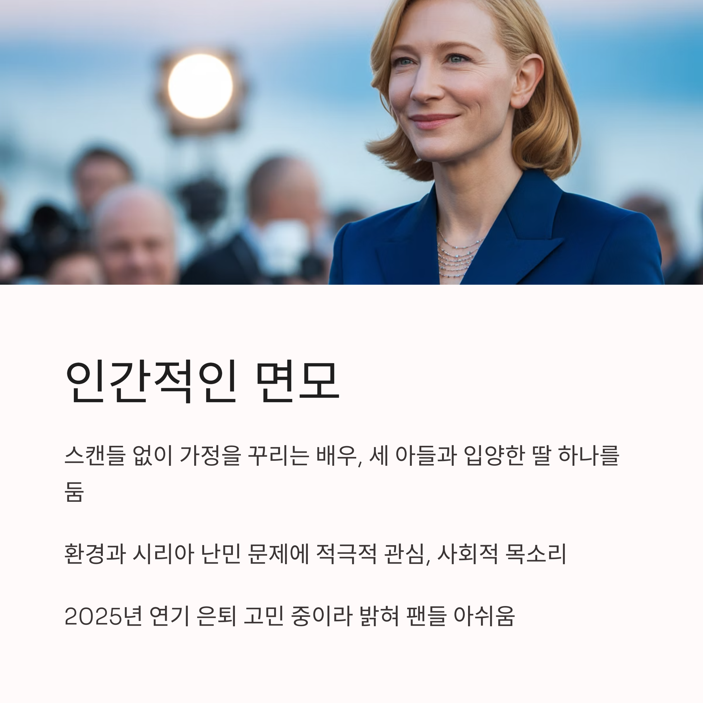 최근 2025년 5월 BBC 라디오에서 연기 은퇴를 진지하게 고민 중이라고 밝혀 팬들의 아쉬움을 샀지만, 《오징어 게임 3》의 깜짝 출연을 통해 다시 한번 그녀의 존재감을 각인시켰습니다. 케이트 블란쳇의 탁월한 연기력과 끊임없는 도전은 앞으로도 많은 이들에게 영감을 줄 것입니다.