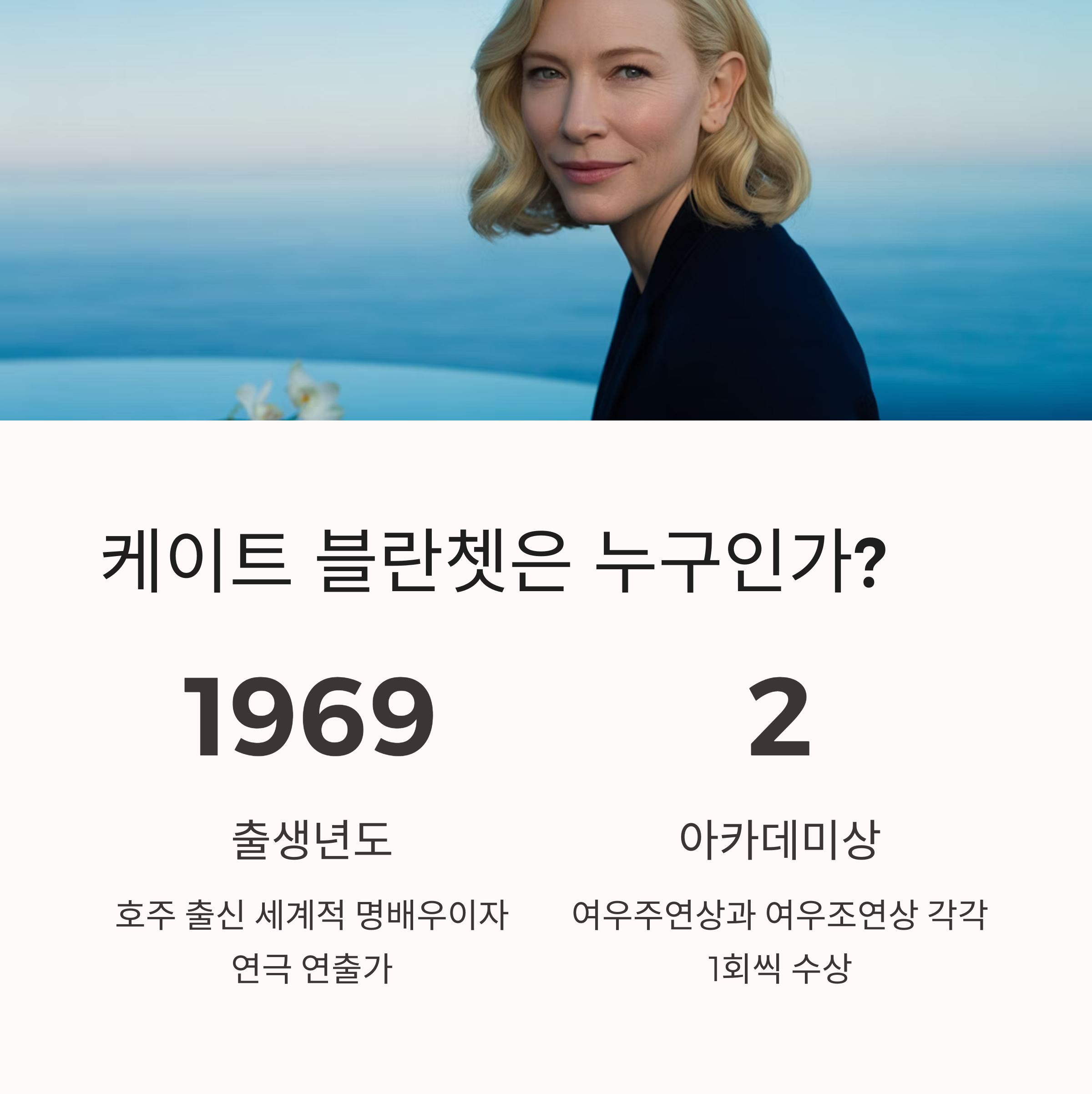 1969년 5월 14일 호주에서 태어난 케이트 블란쳇은 세계적인 명배우이자 연극 연출가입니다. 아카데미 시상식에서 여우주연상과 여우조연상을 각각 1회씩 수상하며, 맡는 역할마다 완벽하게 변신하는 '연기의 신'으로 불립니다.