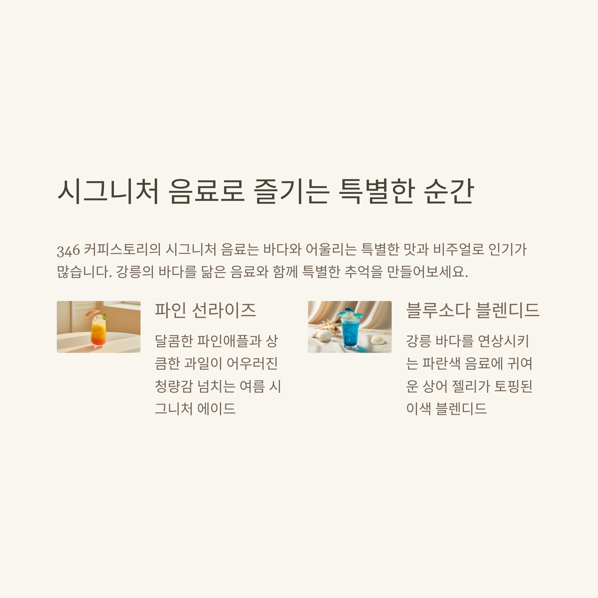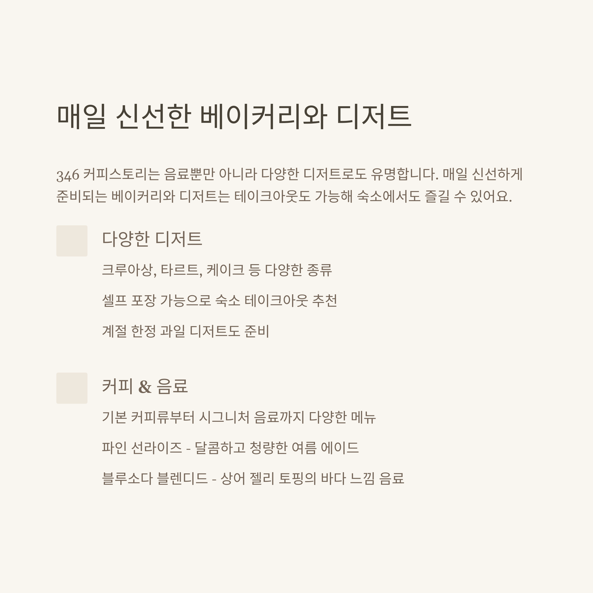 이번 여행에 그런 시간이 필요하다면, 346 커피스토리에서 특별한 하루를 마무리해 보세요.
