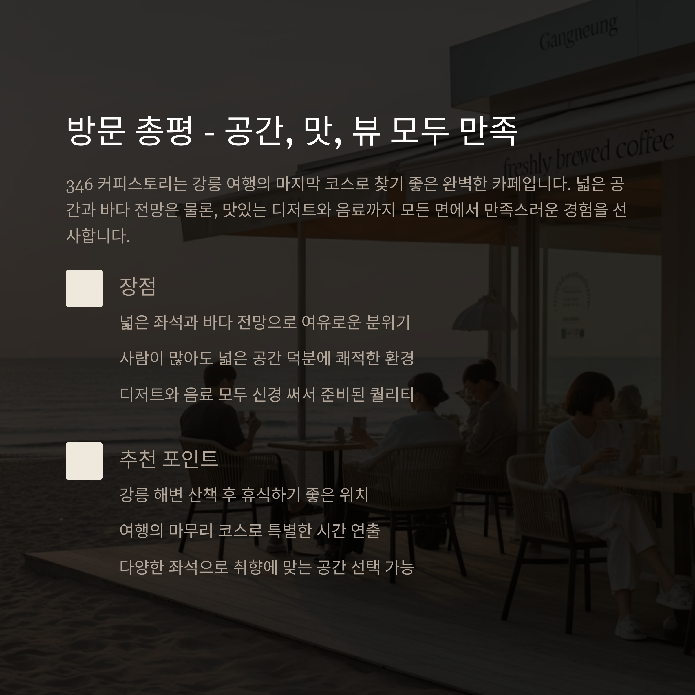 강릉 여행의 마지막 코스로 찾은 346 커피스토리는 공간, 맛, 뷰 모두 만족스러운 곳이었습니다.