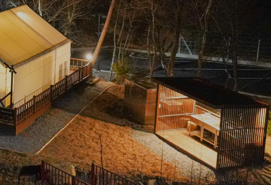 로미지안 가든 글램핑 숙소 앞에는 전용 부엌 공간이 마련되어 있어요. 별도의 그릴도 제공되며, 바비큐 세트를 현장에서 구매하거나 차량으로 약 5분 거리의 하나로마트에서 장을 봐올 수도 있습니다.