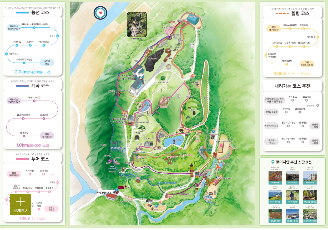 길을 따라 걷다 보면 ‘하얀 고독의 언덕’, ‘깨달음의 자작나무 숲’ 등 이름부터 감성적인 명소들이 이어지며 걷는 재미를 더합니다. 이곳을 둘러보는 것만으로도 마음이 편안해졌다는 리뷰가 많답니다.