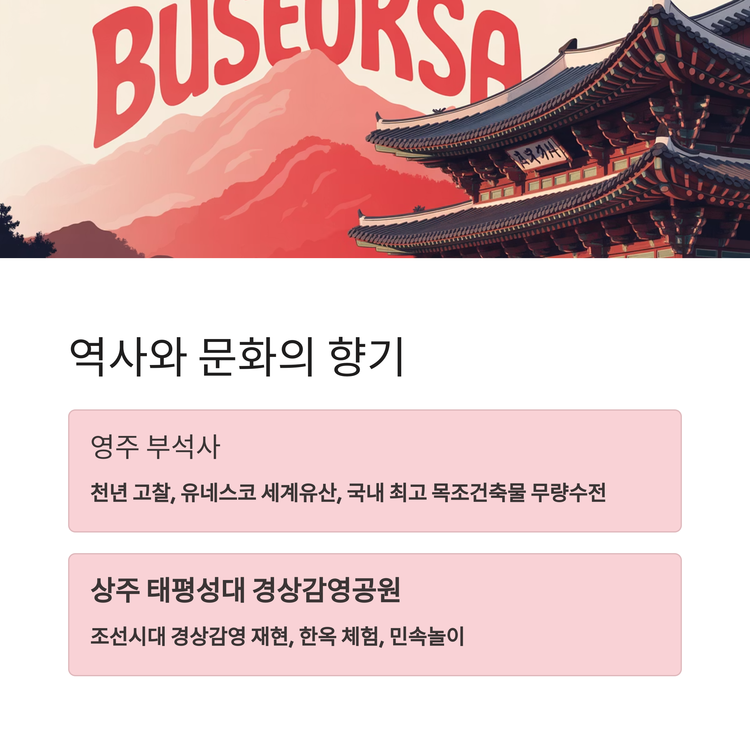 천년 고찰 부석사는 신라 의상대사가 창건한 유네스코 세계유산입니다. 특히 무량수전은 국내 최고 목조건축물로, 역사와 건축미가 절묘하게 어우러진 장소입니다.