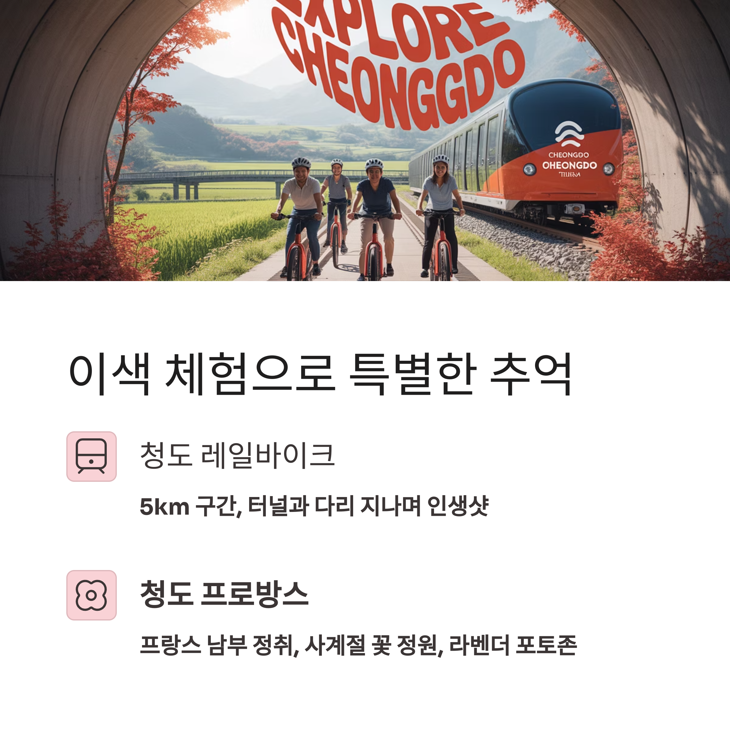 5km 구간을 직접 페달을 밟으며 달리는 레일바이크는 청도의 산과 들을 가장 특별하게 즐길 수 있는 방법입니다. 터널과 다리를 지나는 동안 인생샷 명소가 계속 펼쳐집니다.