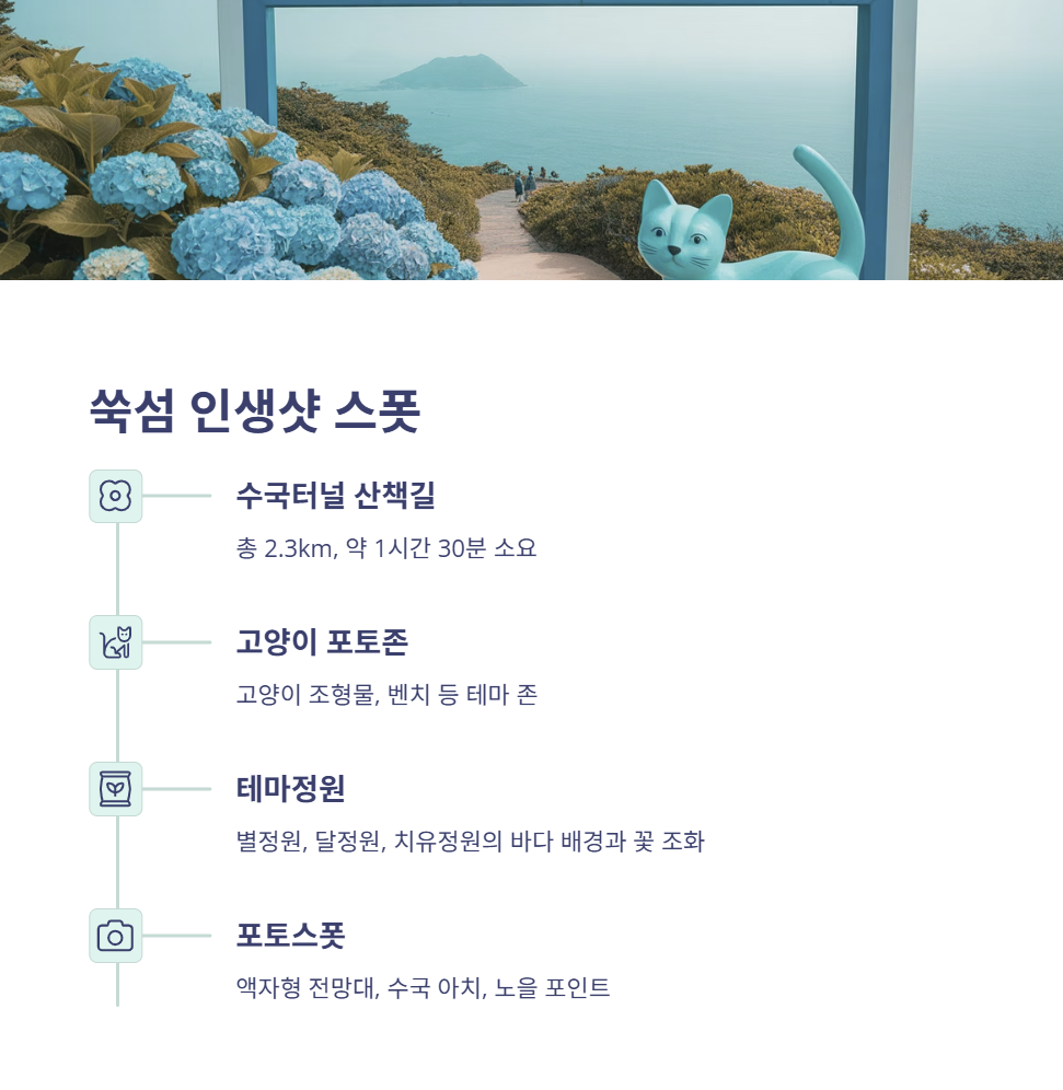 • 포토스폿: 액자형 전망대, 수국 아치, 노을 포인트