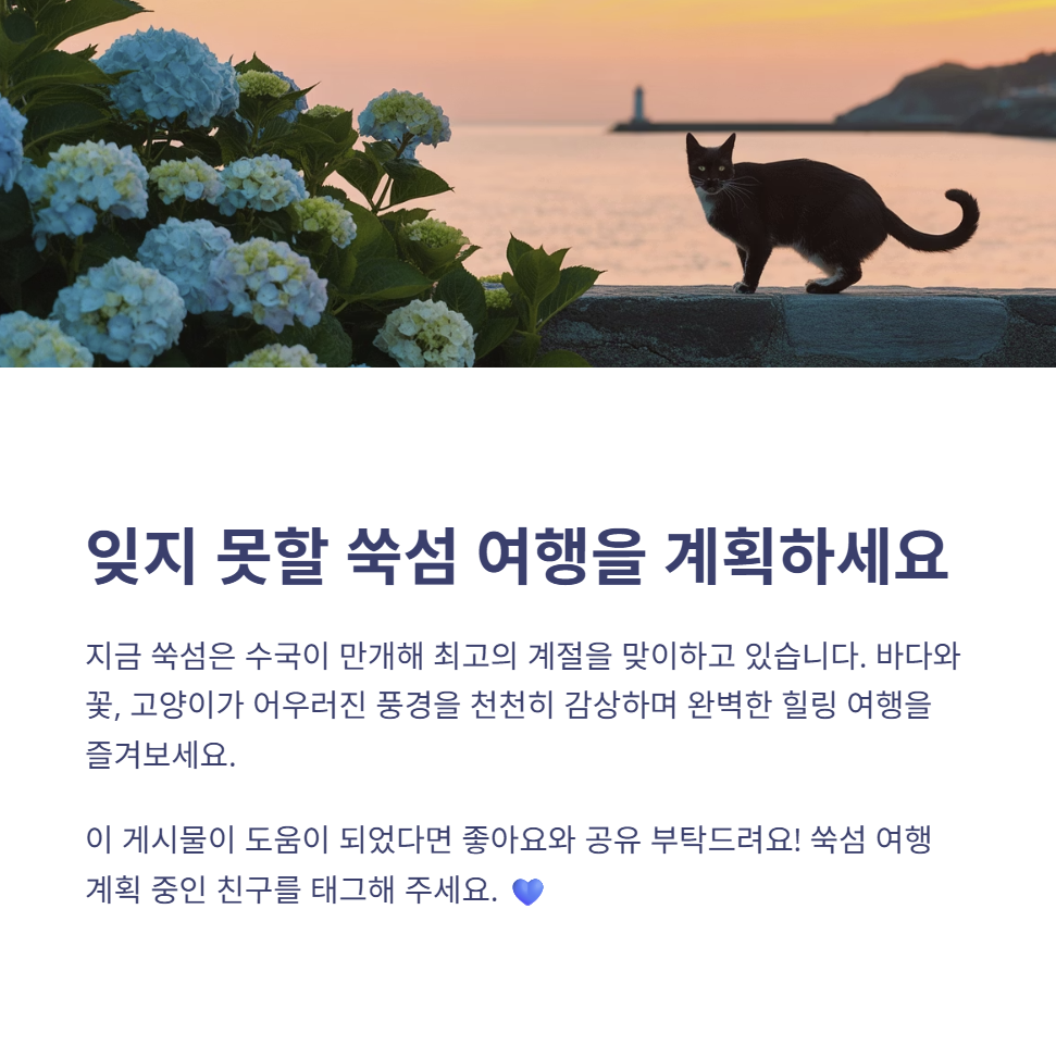 수국과 바다, 그리고 귀여운 고양이까지 함께 어우러져 감성 가득한 여행을 즐길 수 있죠.