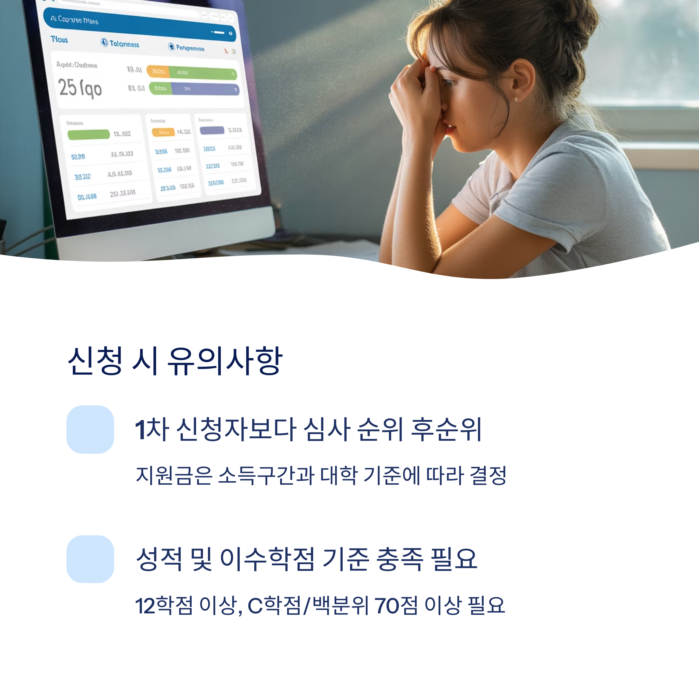국가장학금 2차 신청을 통해 구제신청을 하더라도, 심사 순위는 1차 신청자보다 밀릴 수 있습니다. 또한 지원 금액은 소득 구간과 대학의 자체 장학 기준에 따라 결정됩니다. 12학점 이상 이수, C학점 이상 또는 백분위 70점 이상 등의 기준을 충족해야 장학금을 받을 수 있습니다. 성적과 이수 학점 조건은 대학마다 다를 수 있으므로 별도 확인이 필요합니다.