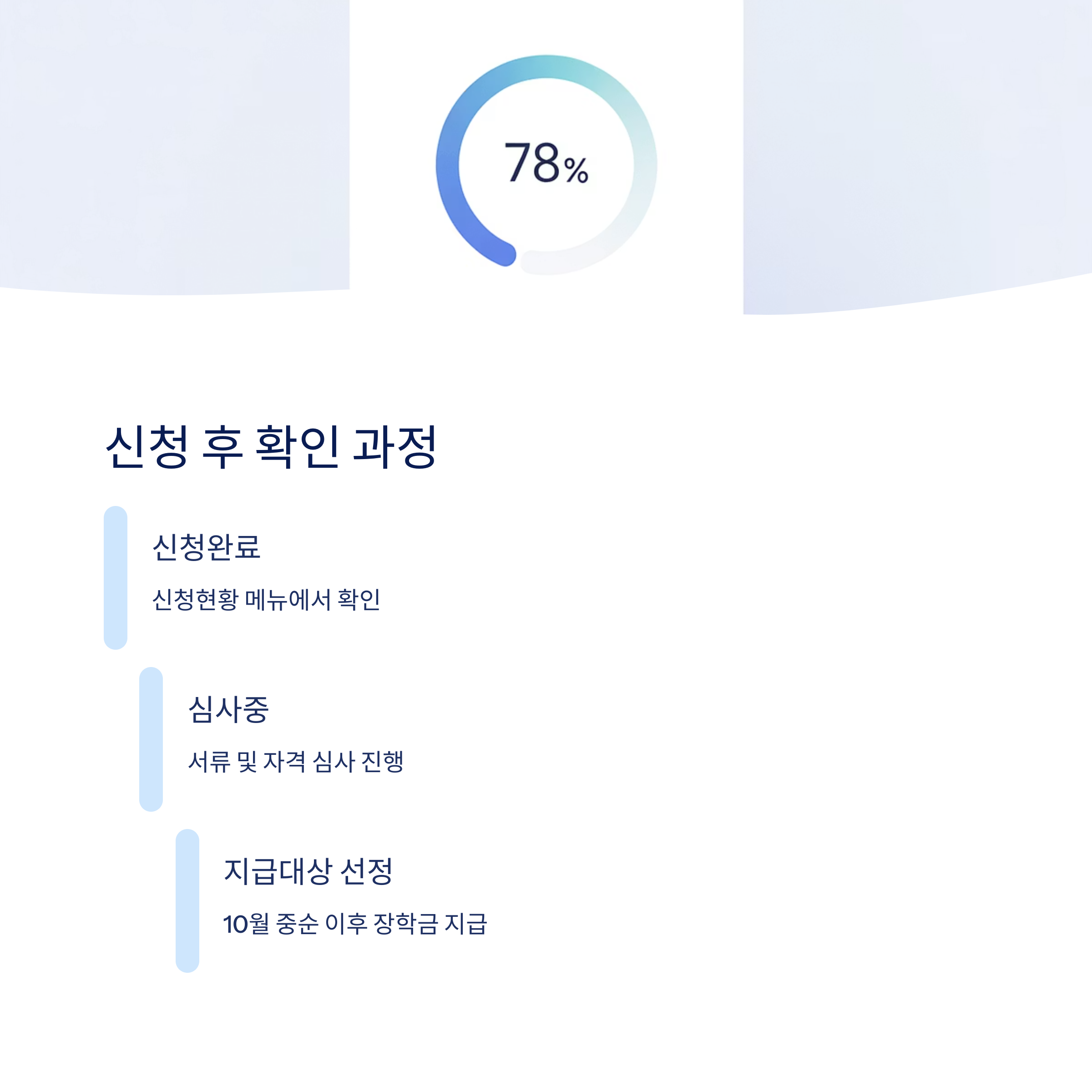 신청 후에는 ‘신청현황’ 메뉴에서 본인의 상태를 확인할 수 있습니다. 일반적으로 진행 단계는 신청완료 → 심사 중 → 지급대상(또는 제외) → 지급완료 순으로 나뉘며, 대부분 10월 중순 이후 장학금이 지급됩니다. 신청만 하고 확인을 하지 않으면 지급 누락이나 서류 누락 등의 실수가 생길 수 있으므로, 알림 설정도 함께 해두는 것이 좋습니다.