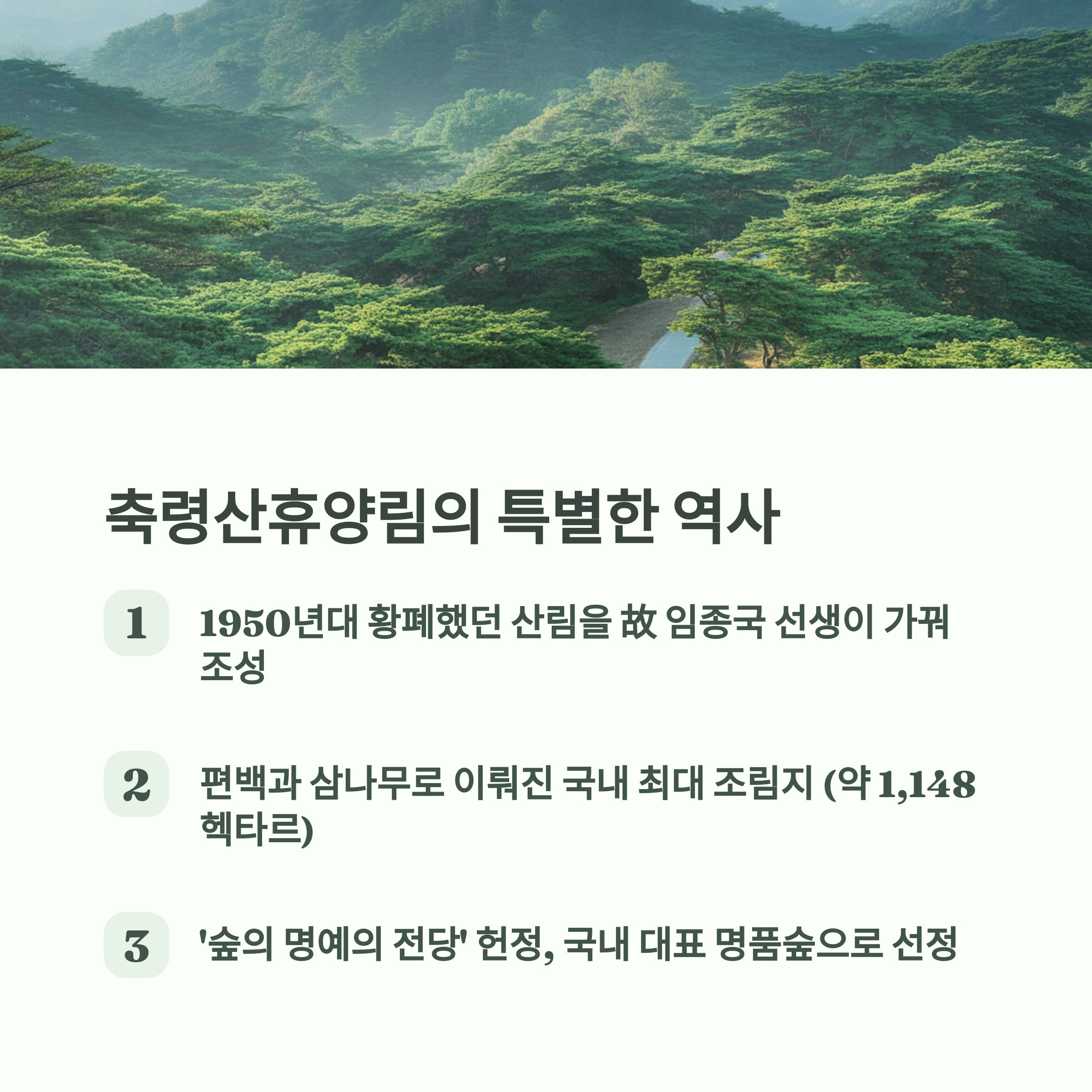 - 편백과 삼나무로 이뤄진 국내 최대 조림지 (약 1,148헥타르)