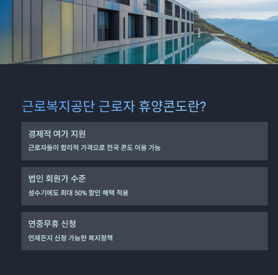 근로복지공단이 직접 운영하는 복지정책 중 하나로, 연중무휴로 신청 가능하며, 특히 여름 성수기에는 최대 50% 이상 할인된 요금으로 숙박이 가능하다는 점이 가장 큰 매력입니다.