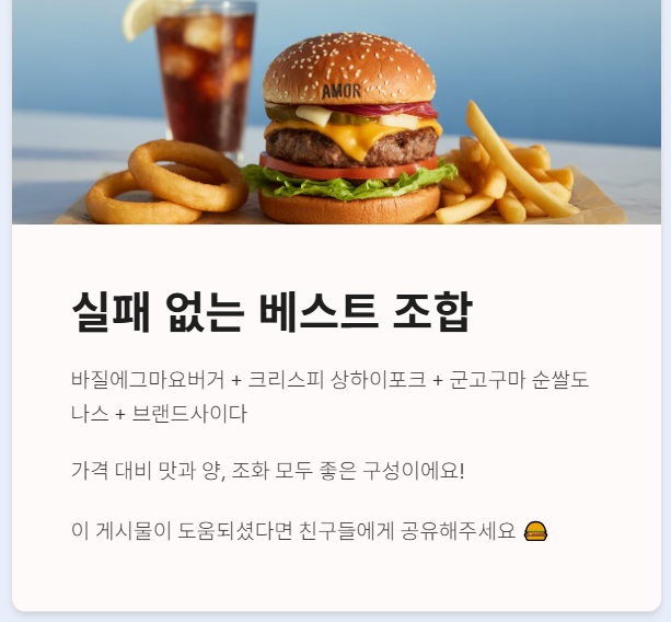 노브랜드버거 시그니처메뉴 베스트 조합을 추천드리자면 아래 구성이 가장 만족도 높습니다.