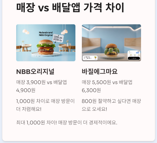 노브랜드버거는 배달앱으로도 간편하게 주문할 수 있지만, 가격 차이가 꽤 큰 편입니다.