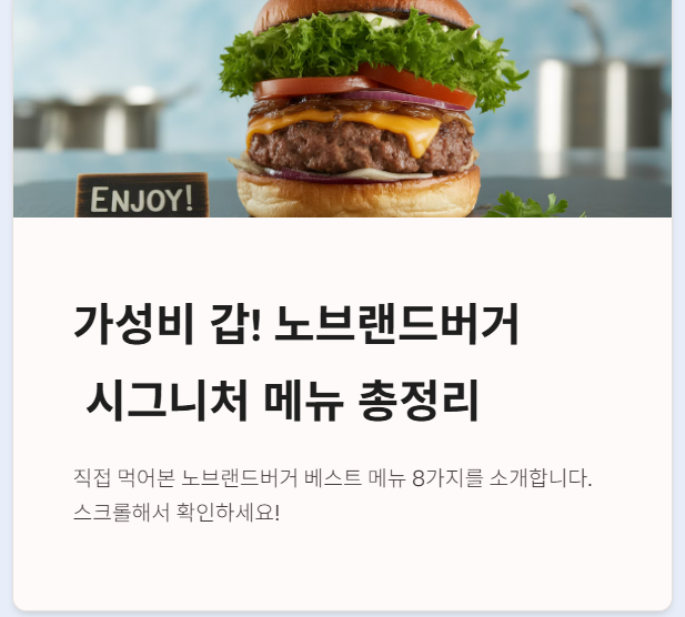 노브랜드버거 시그니처메뉴는 단순히 가성비만 좋은 버거가 아니라, 브랜드 정체성과 맛의 다양성을 동시에 느낄 수 있는 구성입니다.