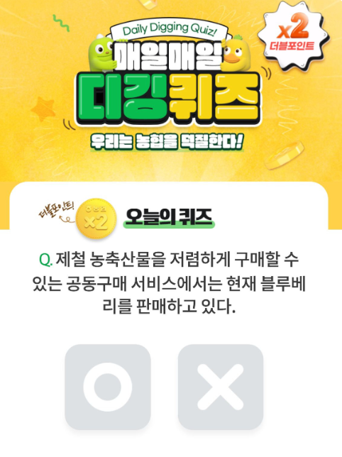 [해설 포인트] 오늘 퀴즈에서 언급된 '블루베리'는 현재 올원뱅크 공동구매 서비스에서 진행 중인 품목이 아닙니다. 이 서비스는 제철에 맞는 신선한 농축산물을 한정 기간 동안 저렴하게 제공하는데, 퀴즈의 문장과 실제 판매 안내 품목이 일치하지 않으므로 'X'를 선택하셔야 리워드 적립이 가능합니다.