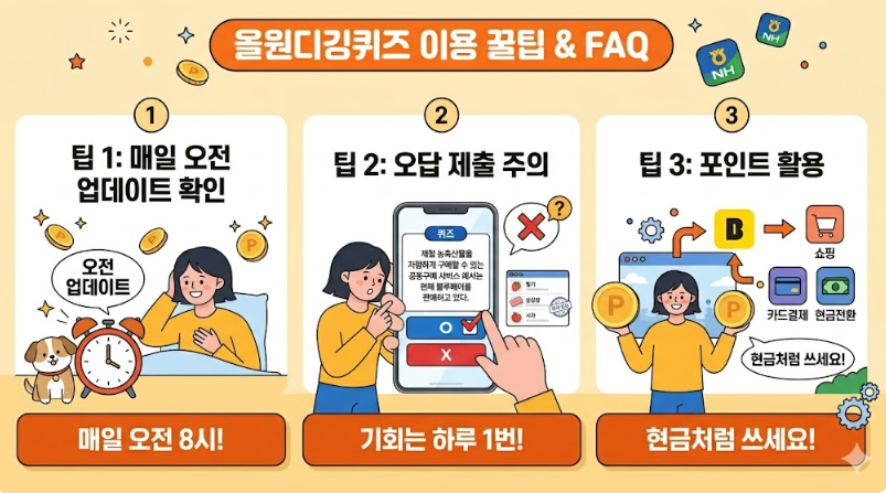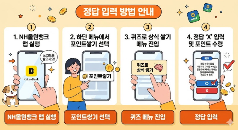 - 혜택: 정답을 맞히면 지급되는 포인트는 농협 계좌나 카드 사용 시 현금처럼 유용하게 활용할 수 있어 매우 알찬 앱테크 수단입니다.
