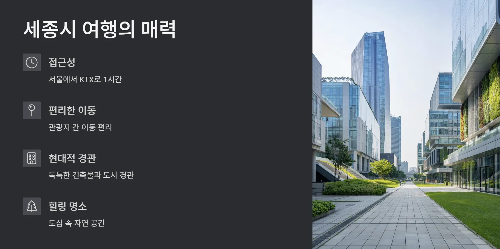 세종특별자치시는 행정중심복합도시로 계획된 만큼 깔끔한 도시 설계와 함께 다양한 문화·자연 명소를 갖추고 있습니다. 서울에서 KTX로 1시간, 대전에서는 30분 이내 거리에 위치해 당일치기 여행지로 제격입니다. 특히 세종호수공원, 국립세종도서관, 세종중앙공원 등 도심 속 힐링 명소가 밀집해 있어 짧은 시간에도 알찬 여행이 가능합니다.