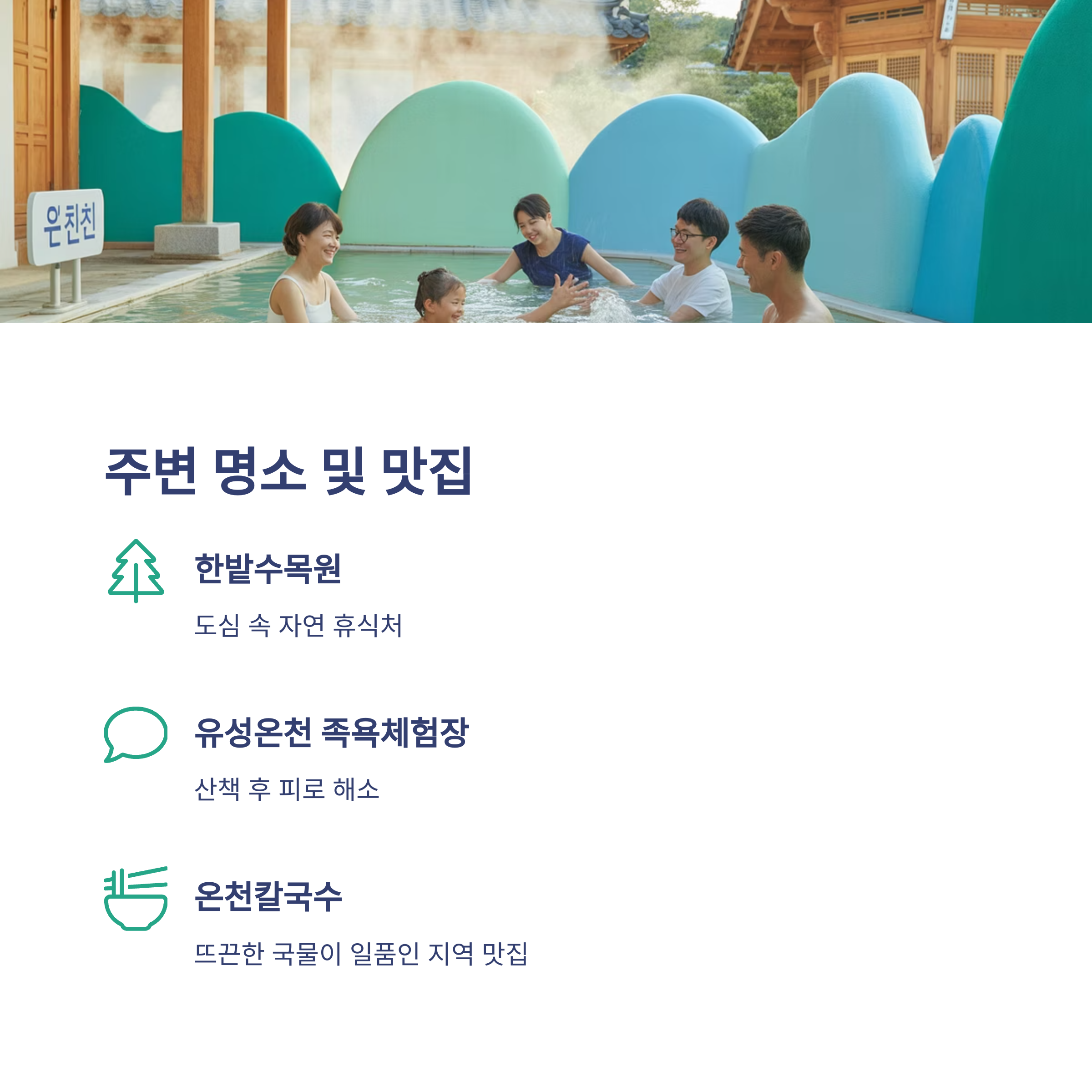 - 유성온천 족욕체험장: 온천수가 흐르는 족욕장. 산책 후 피로 해소 장소로 제격이에요.