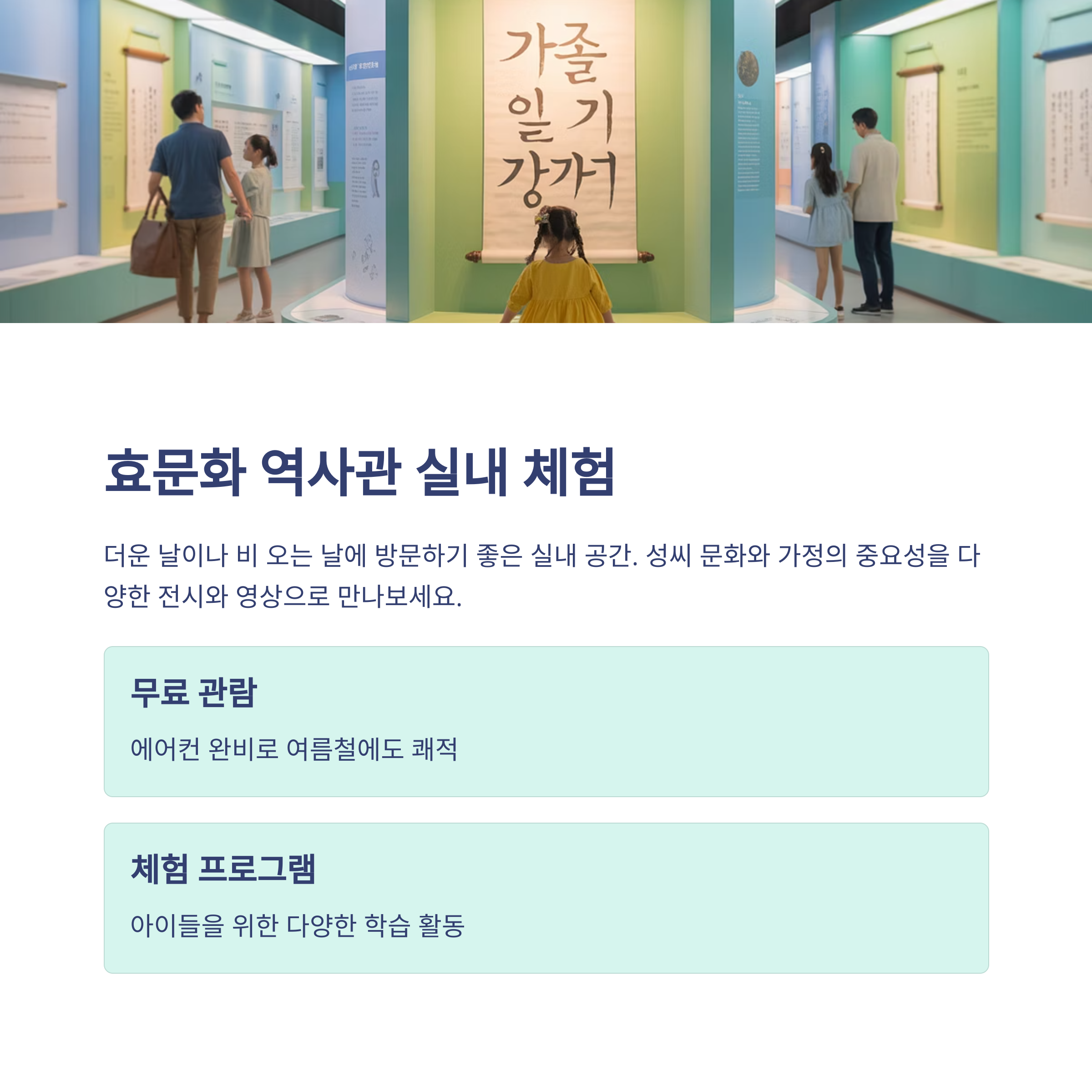 더운 날이나 비 오는 날에는 효문화 역사관 방문을 추천드려요. 성씨 문화와 가정의 중요성을 다양한 전시와 영상 콘텐츠로 만나볼 수 있는 실내 공간이에요. 전시 외에도 아이들을 위한 체험형 프로그램도 준비되어 있어 학습 효과까지 기대할 수 있습니다.