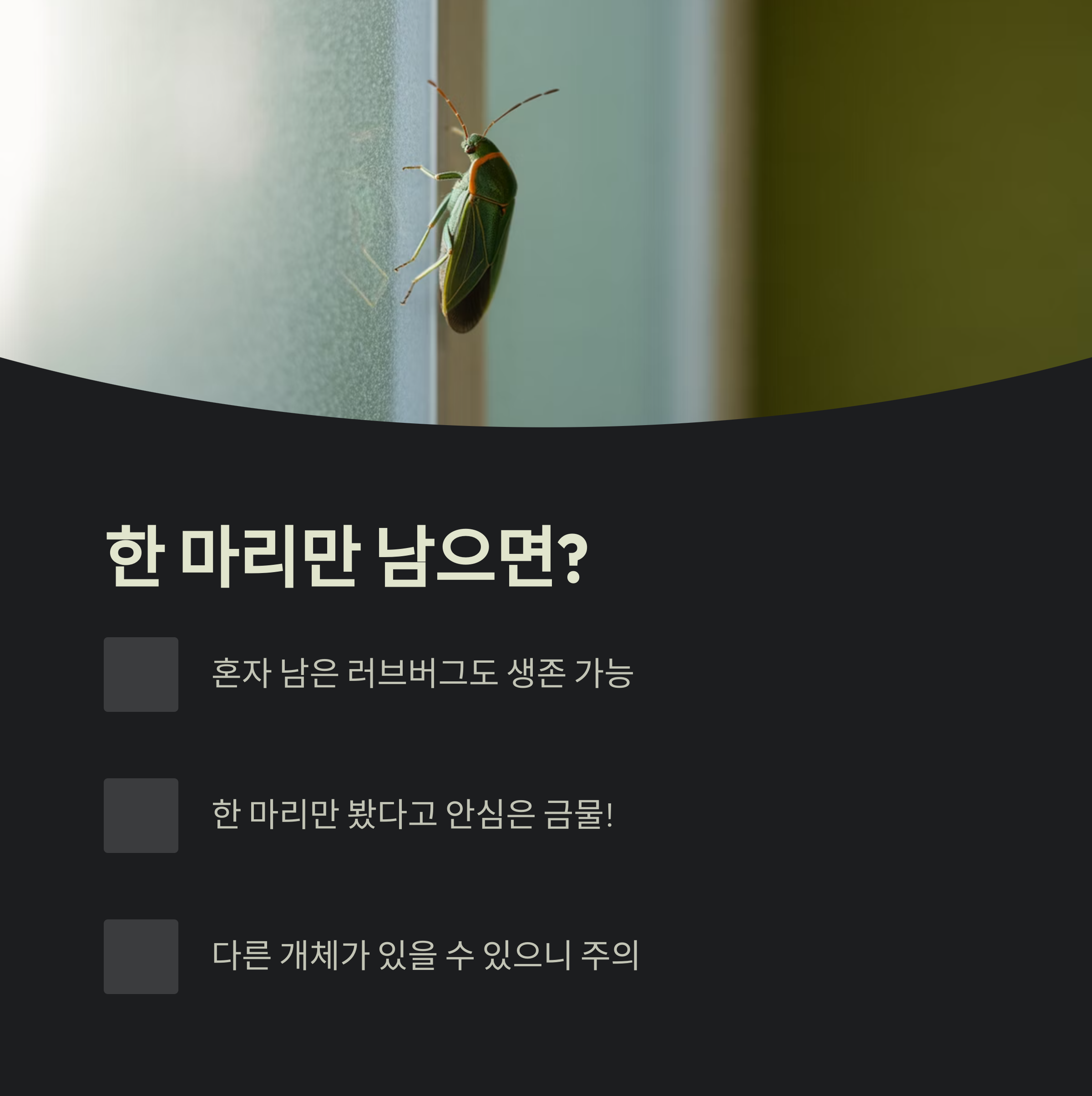 결론부터 말하자면, 혼자 남은 러브버그도 살아갈 수 있어요. 즉, 짝을 잃는다고 해서 남은 개체가 바로 죽지는 않아요. 생존에 필요한 활동은 각자 할 수 있기 때문에, 집 안에서 한 마리만 봤다고 해서 “다 해결됐다”는 생각은 금물이에요. 언제든 또 다른 개체가 있을 수 있으므로 주의가 필요하죠.