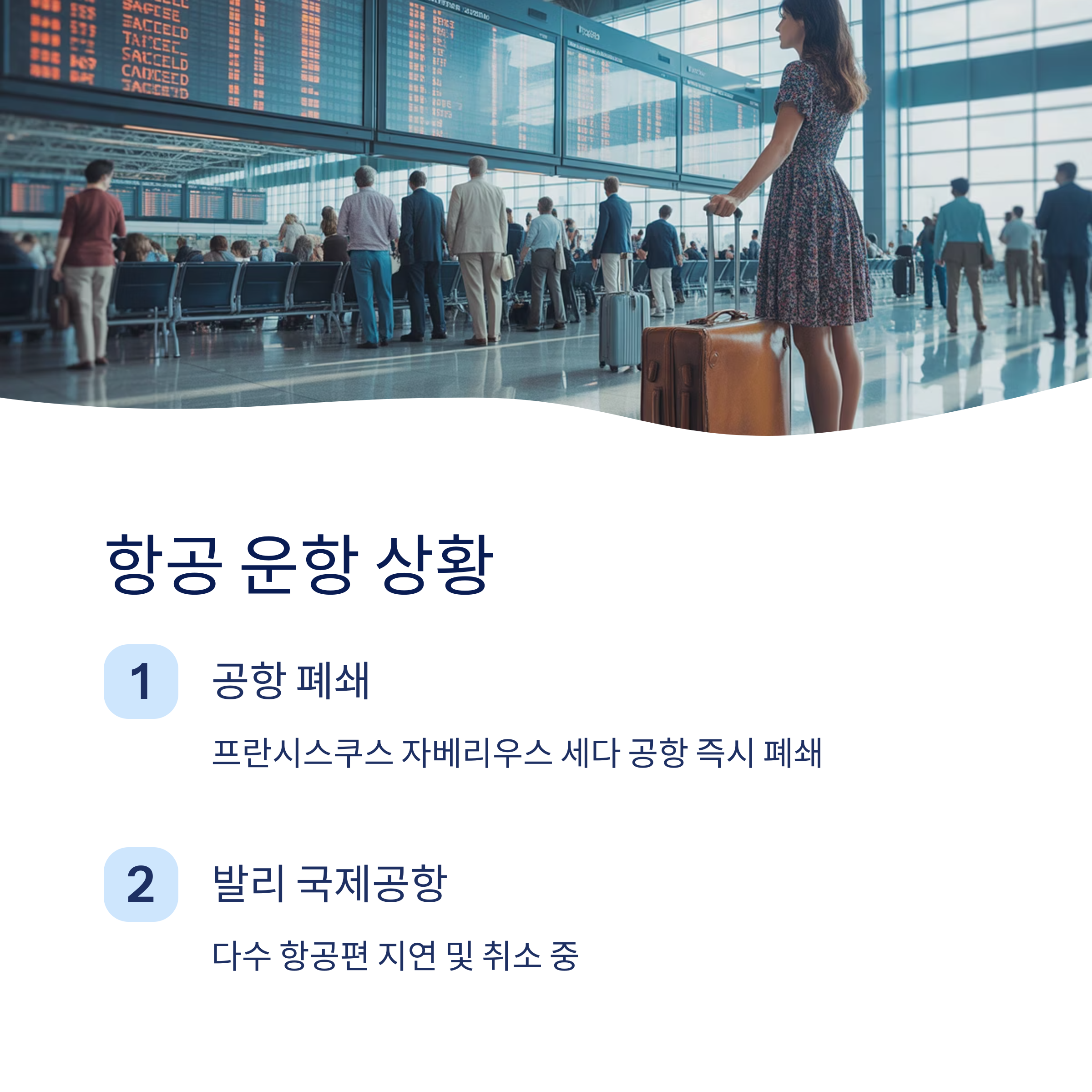 - 공항 이용 시 주의: 공항 운영이 재개되더라도 혼잡이 예상됩니다. 넉넉한 여유 시간을 확보하고, 마스크와 간단한 응급 키트를 준비하는 것이 유용합니다.