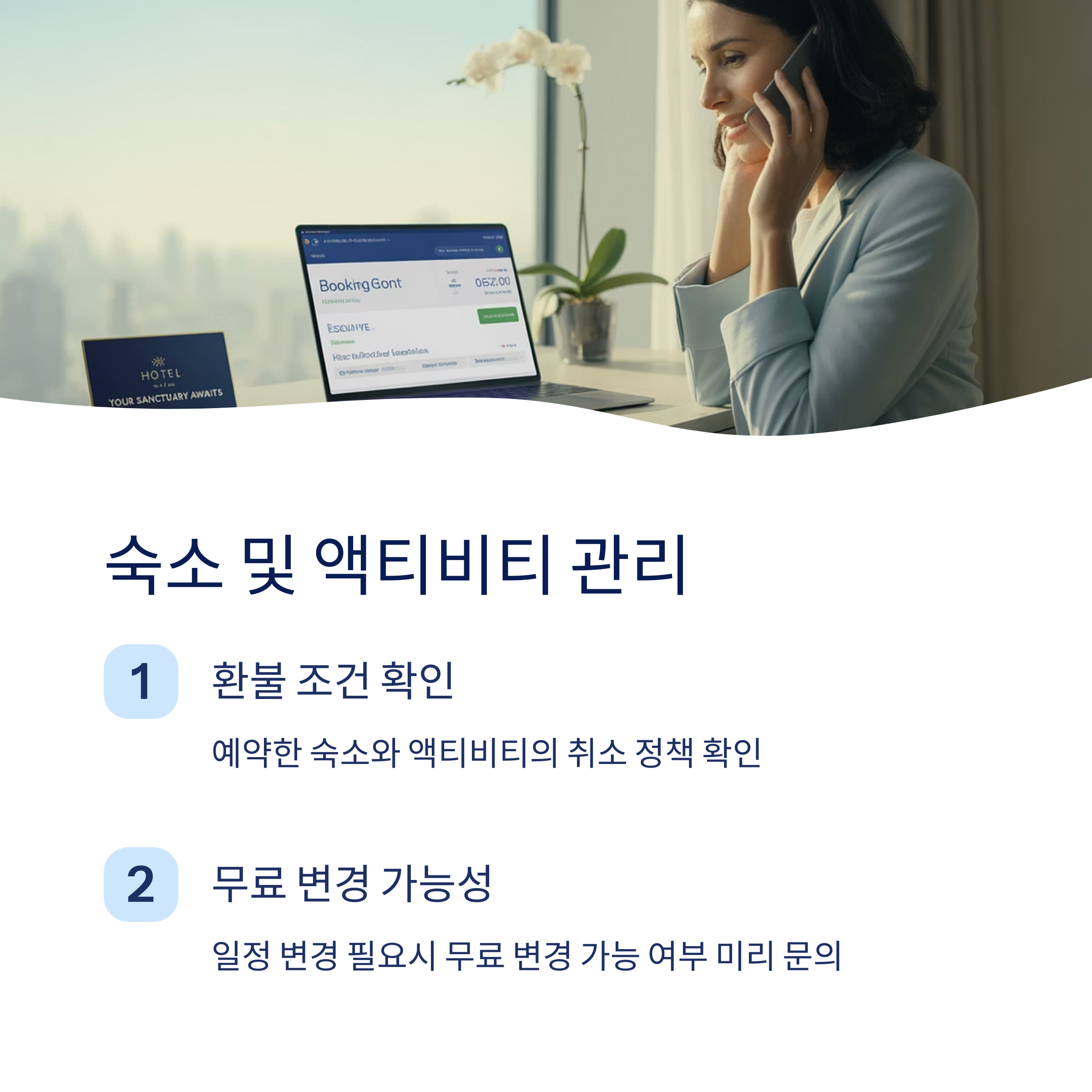 - 숙소 및 액티비티 예약 유연화: 숙소나 미리 예약해둔 액티비티의 환불 가능 조건을 확인하고, 필요시 무료 변경이 가능한지 미리 문의해두는 것이 좋습니다.