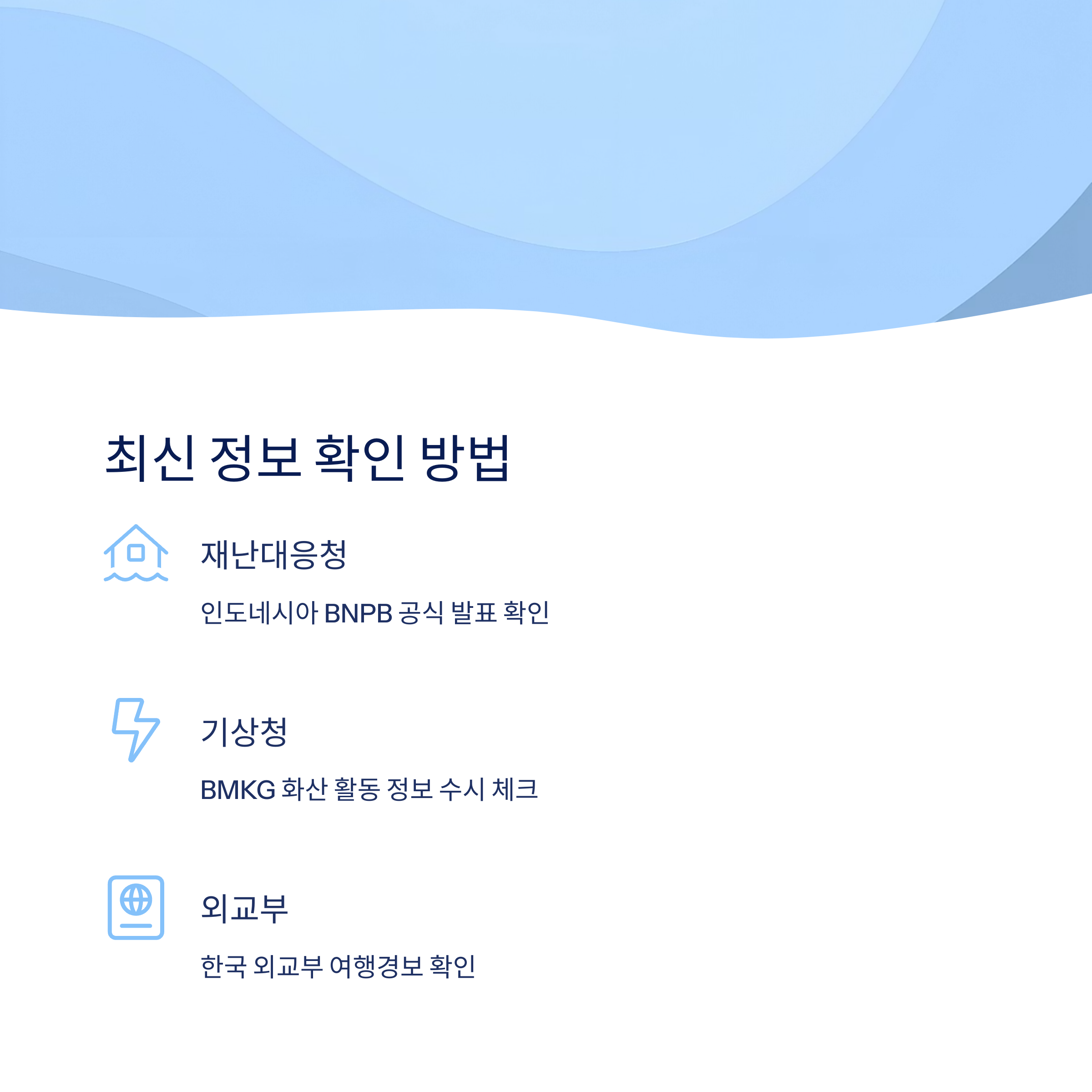 - 화산/기상청 정보 수시 확인: 인도네시아 재난대응청(BNPB), 기상청(BMKG)의 공식 발표와 한국 외교부의 여행경보를 수시로 확인하여 최신 정보를 얻으세요.