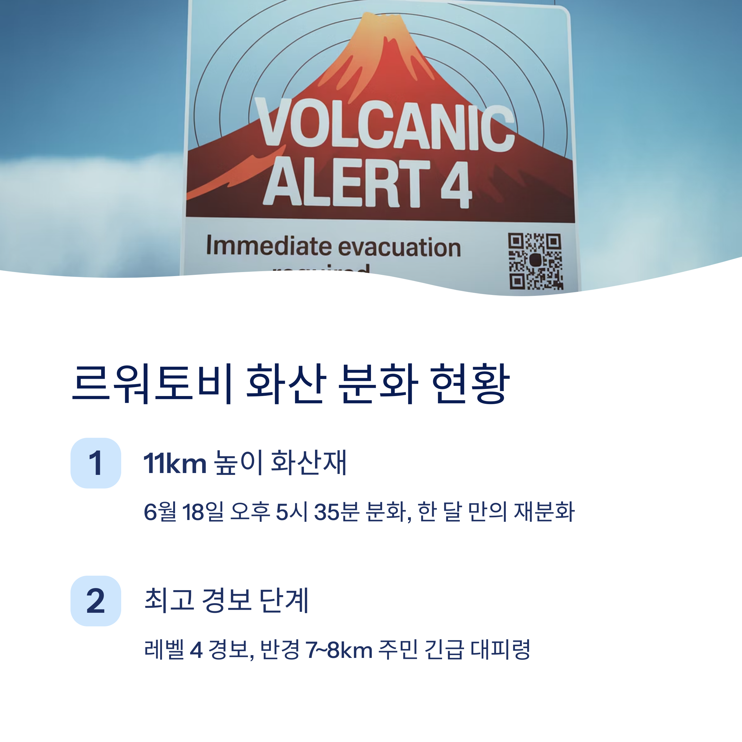 지난 6월 18일(현지 시각) 오후 5시 35분경, 르워토비 화산은 높이 11km에 달하는 화산재 기둥을 뿜어냈습니다. 이는 지난달 5.5km 규모 분화에 이어 한 달 만의 재분화이며, 작년 11월 인명 피해를 유발했던 전례까지 있어 현지 당국은 화산 경보를 **최고 단계(레벨 4)**로 격상하고 반경 7~8km 이내 주민들에게 긴급 대피령을 내렸습니다.