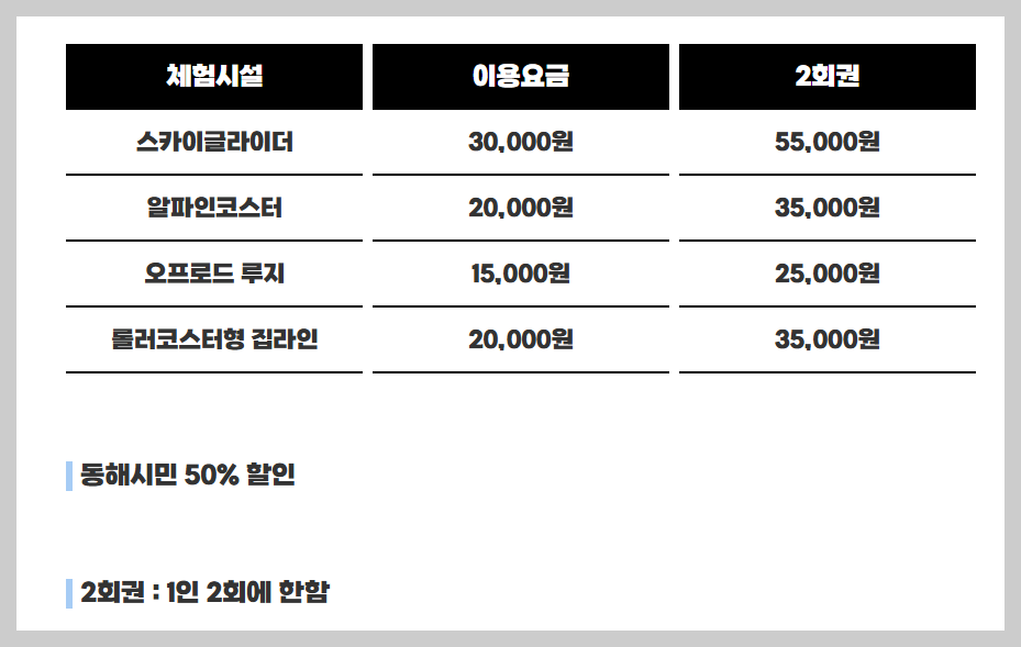 - 스카이글라이더: 30,000원 (왕복 777m 활강)
