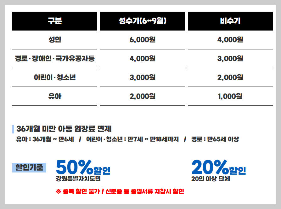 강원특별자치도민은 50% 할인 가능하며, 36개월 미만 유아는 무료입니다. 온라인 예매 시 조기 매진되는 경우도 많아 사전 예약을 추천드려요.