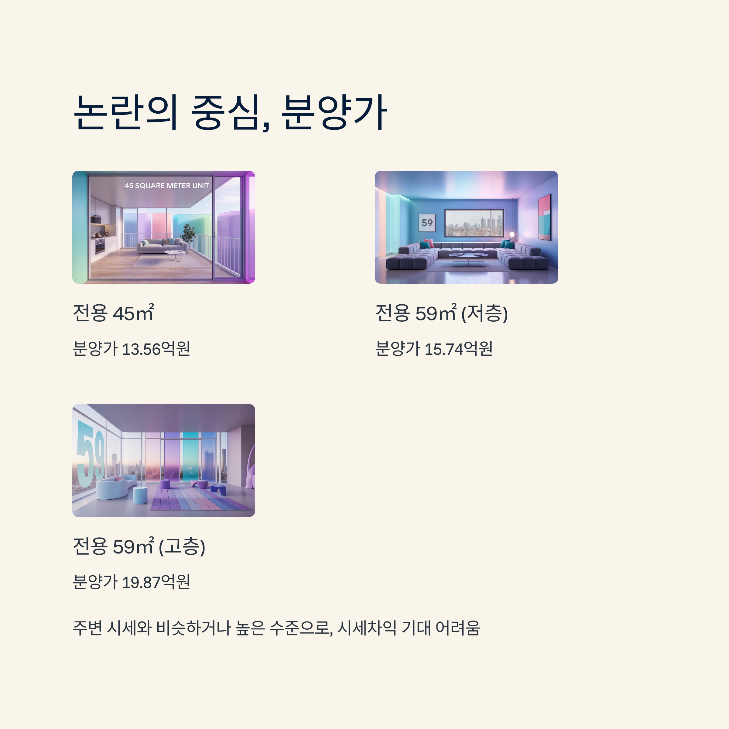 래미안 왕십리나 센트라스 전용 59㎡가 최근 9억 원대 초중반에서 거래되는 것을 고려하면, 인근 시세 대비 최소 3억 원 이상 높은 고가 분양이라는 평가가 나옵니다. 따라서 이번 라체르보 푸르지오 써밋 무순위 청약으로 시세차익을 기대하기는 사실상 어렵다는 것이 시장의 전반적인 시각입니다.