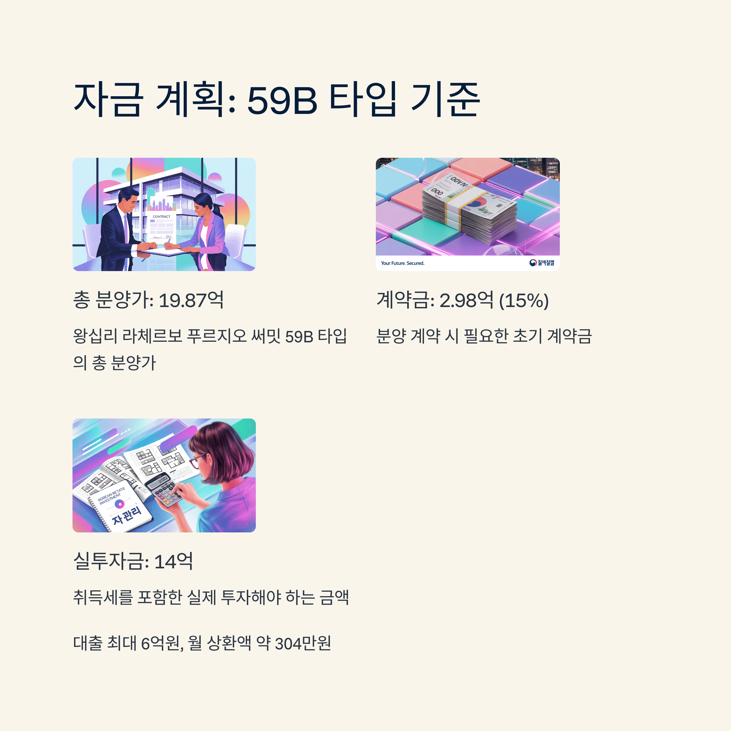 라체르보 푸르지오 써밋 59B 타입(고층 19.87억 기준)을 기준으로 자금 계획을 세워보면 다음과 같습니다.