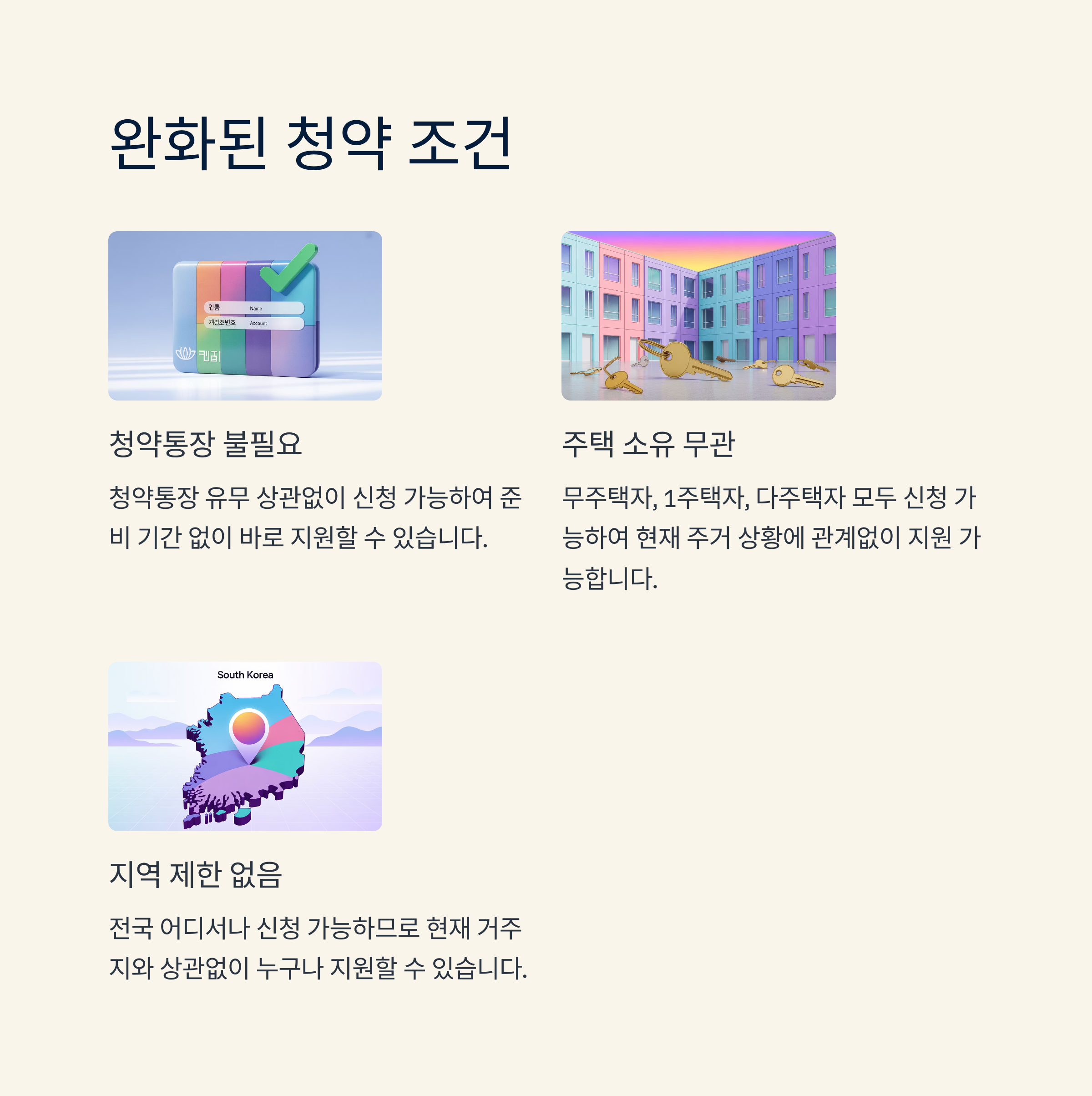 - 청약통장 불필요: 청약통장 유무와 상관없이 누구나 신청할 수 있습니다.