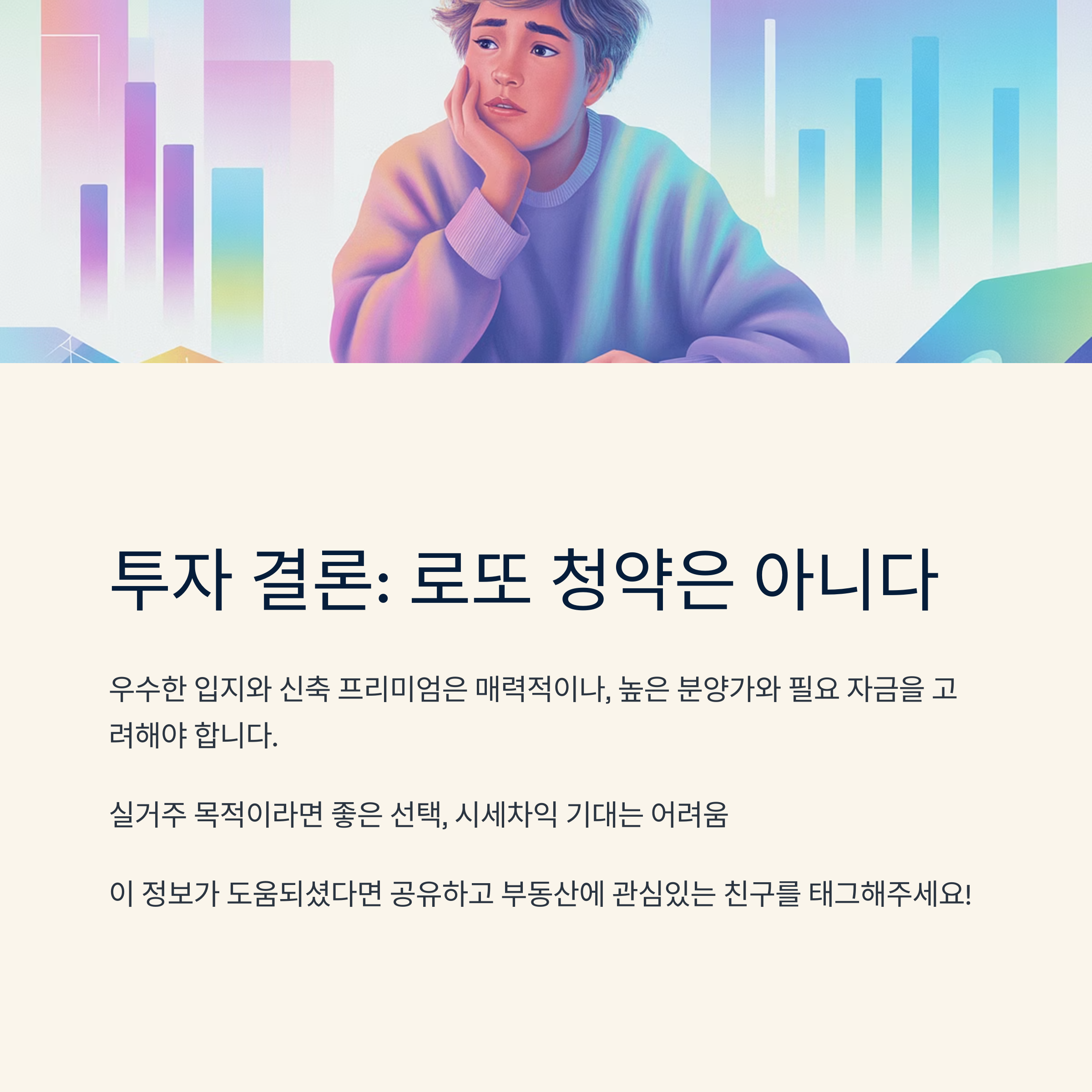 - 단점: 가장 큰 문제점은 '분양가'입니다. 이미 주변 시세와 유사하거나 오히려 높은 수준으로 책정되어 시세차익을 기대하기 어렵습니다. 또한 6.27 대출 규제로 인해 주택담보대출 한도가 제한되어 필요한 현금 보유액이 매우 크다는 점도 부담입니다.