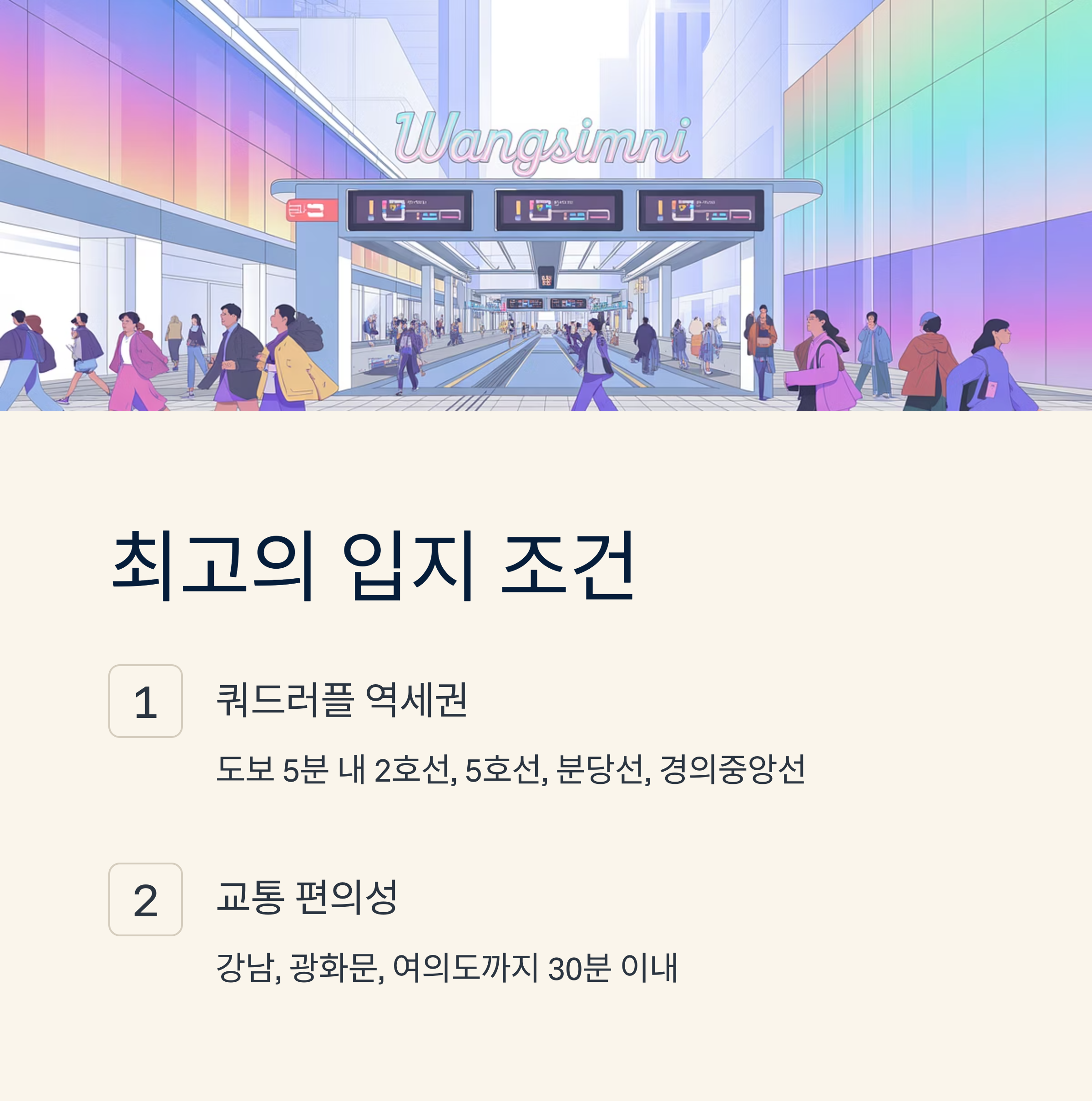 - 장점: 압도적인 왕십리 역세권 입지, 주변 학군 및 생활 인프라의 우수성, 958세대의 대단지 신축 아파트라는 점, 그리고 청약 통장이나 주택 소유 여부와 무관하게 전국 어디서나 신청 가능하다는 점은 큰 메리트입니다. 특히 곧바로 입주 가능한 신축 아파트를 찾는 실수요자에게는 매력적인 선택지일 수 있습니다.