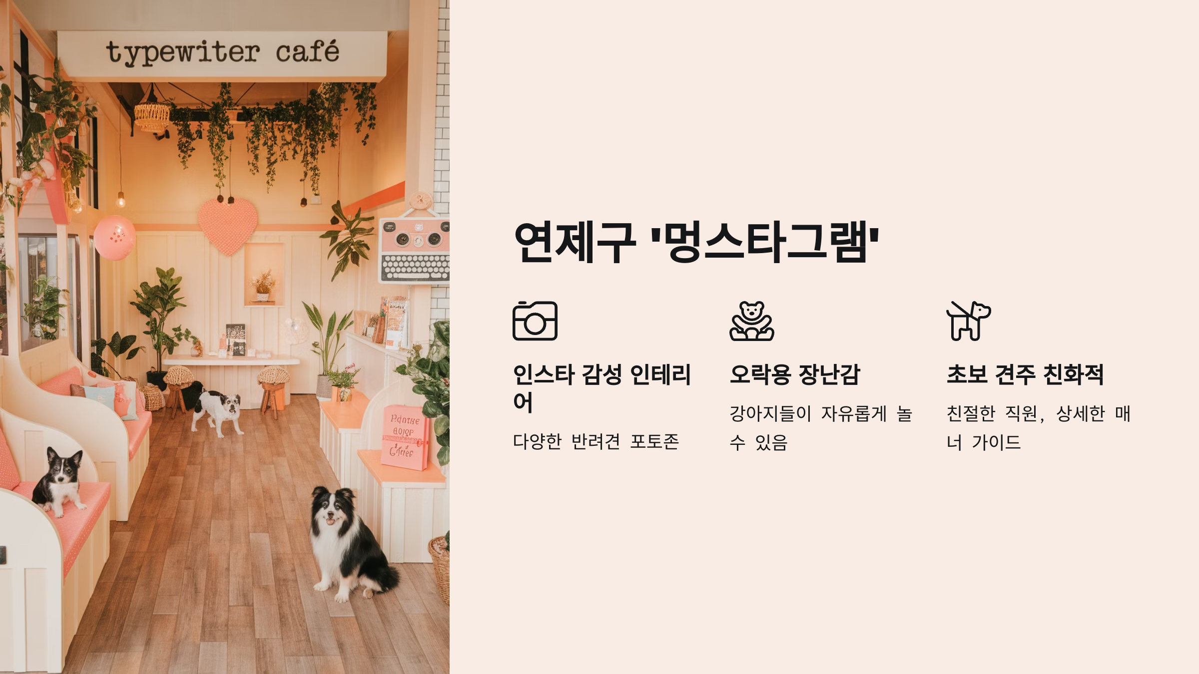 이름부터 귀여운 ‘멍스타그램’은 실내 감성 인테리어가 예쁜 부산 연제구 애견카페예요. 전반적으로 인스타 감성 가득한 공간에 반려견 포토존이 다양하게 준비돼 있어요. 사진 찍는 재미가 쏠쏠하고, 강아지들이 좋아하는 오락용 장난감도 비치돼 있어 자유롭게 놀 수 있어요.