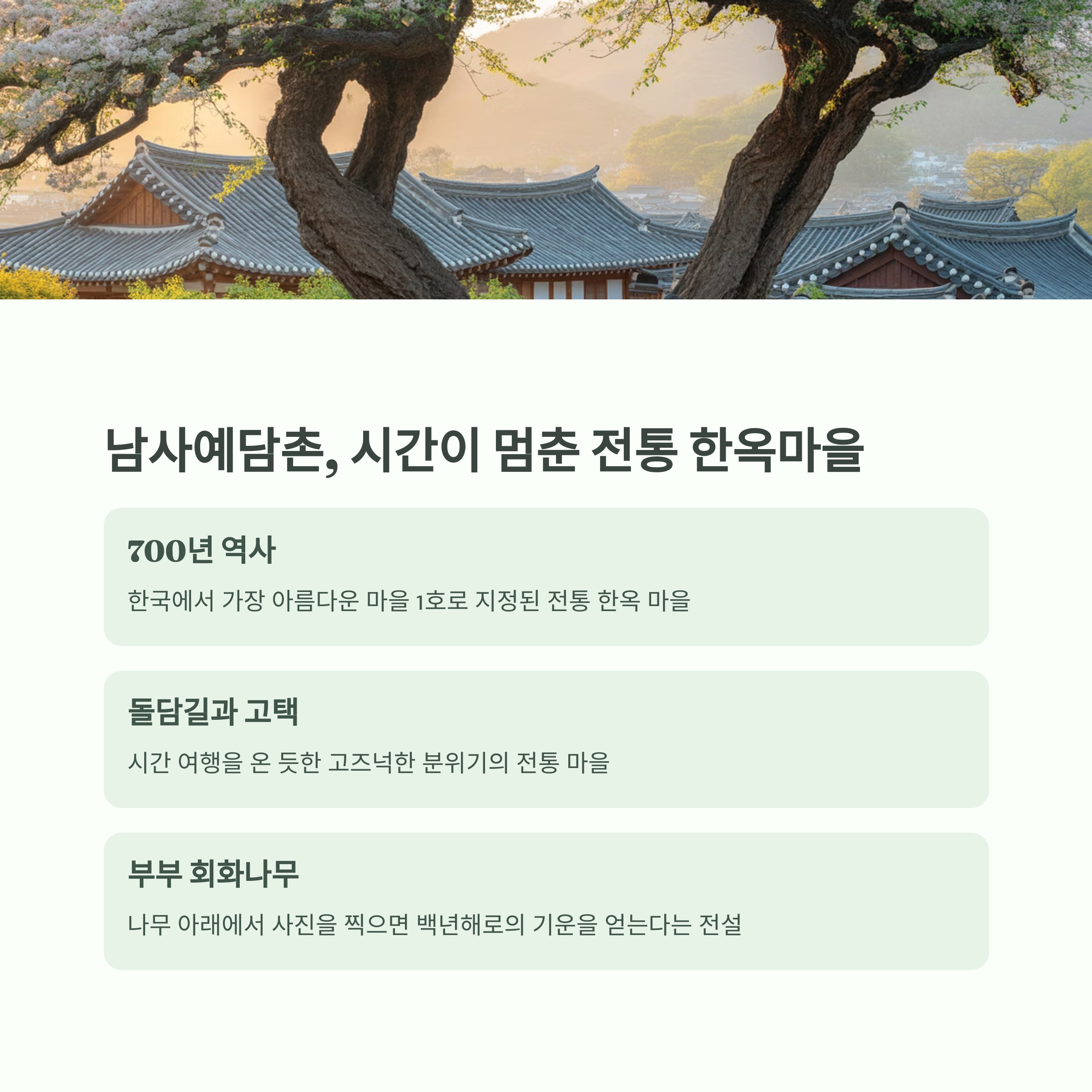 한적하면서도 전통과 문화가 살아 숨 쉬는 이곳은 가족 여행, 커플 여행, 부모님 효도여행 모두에 어울리는 최고의 여행지예요.