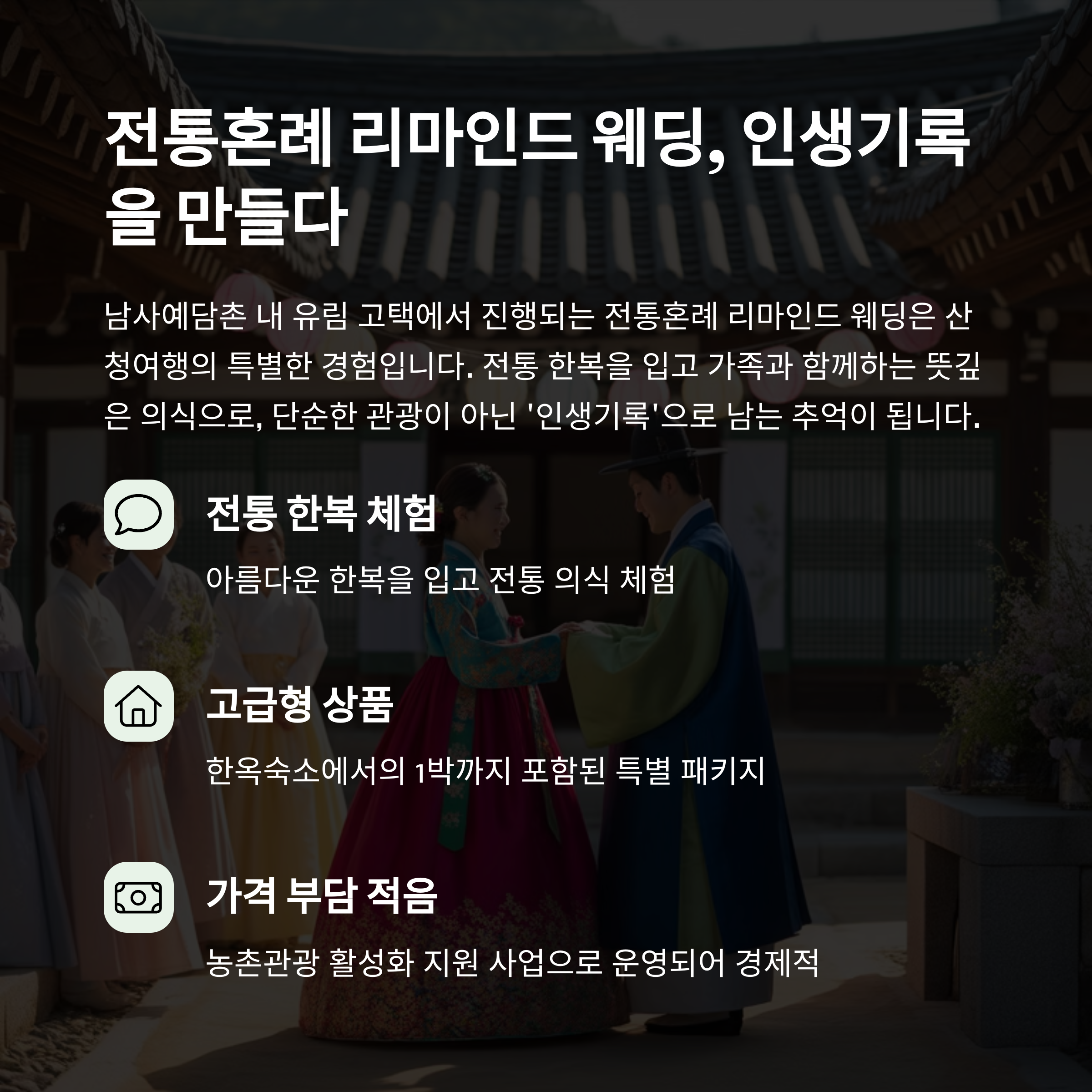 남사예담촌 내 유림 고택에서 진행되는 전통혼례식은 전통 한복 체험은 물론, 가족 단위로 함께 즐기는 뜻깊은 행사랍니다.