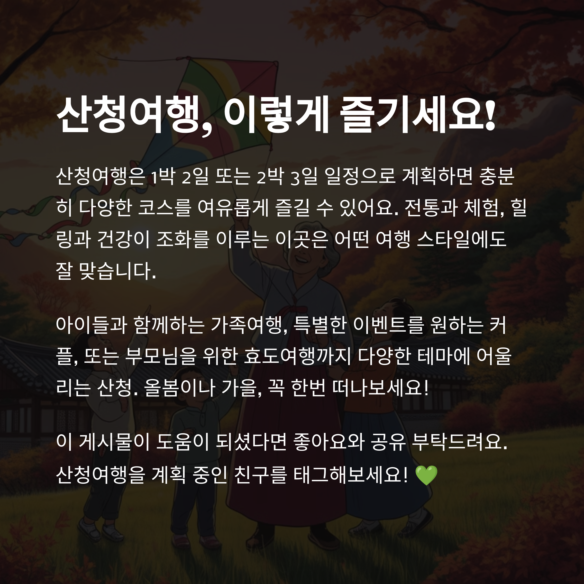 아이들과 함께하는 가족여행, 특별한 이벤트를 원하는 커플, 또는 부모님을 위한 효도여행까지 다양한 테마에 어울리는 산청.